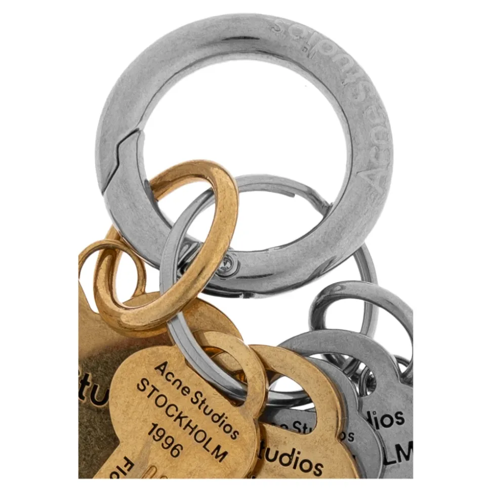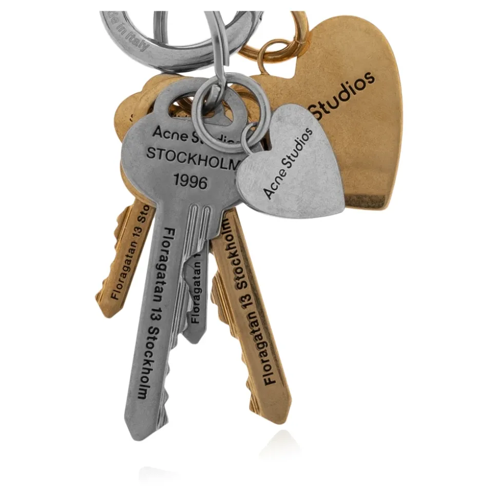 Acne Studios Nøglering kombinerer aflange nøgler og hjerteformede charms i en halvmat guld- og sølvfinish, hvilket skaber et skulpturelt tilbehør med et præcist indgraveret logo. Nøgleattributter: Guld | Sølv | Messing | Holdbar metalkonstruktion | Flere charm-vedhæftninger | Splitring til nøgler eller taske-charm | Alsidig brug som nøglering eller tilbehør | Hjerte- og nøgle-charms | Indgraveret Acne Studios logo | Halvmat guld- og sølvfinish | Skandinavisk minimalistisk detaljering | Dimensioner og pasform: Total længde: 90 mm | One size | Sammensætning og pleje: Skal: 100% Messing | Kontrast: 100% Zamak | Kontrast: 100% Jern