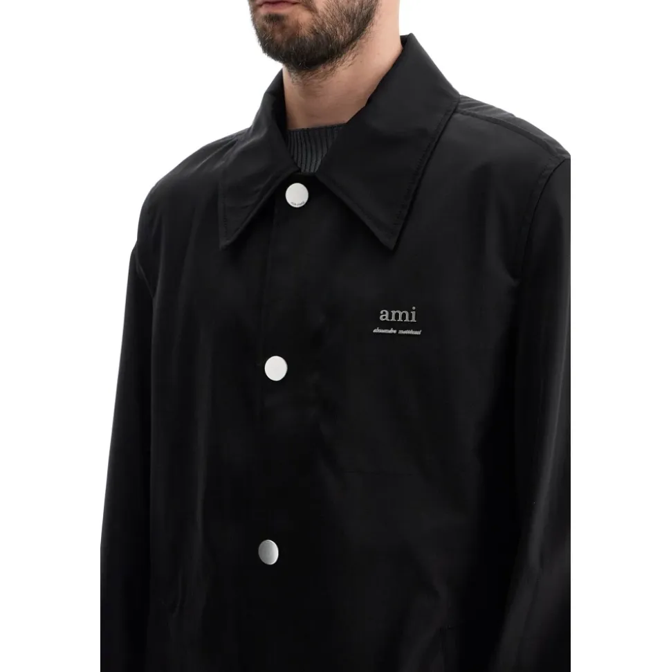 Forøg din stil med Ami Paris unisex bilfrakke, lavet af nylon og bomuldstwill. Denne klassiske enkeltknap design har mærkede knapper, en skjortekrave, sidelommer og en central slids bagpå. Med en regelmæssig pasform og lige snit er denne frakke et alsidigt tilbehør til din garderobe. Modellen er 187 cm høj og bruger størrelse L.
