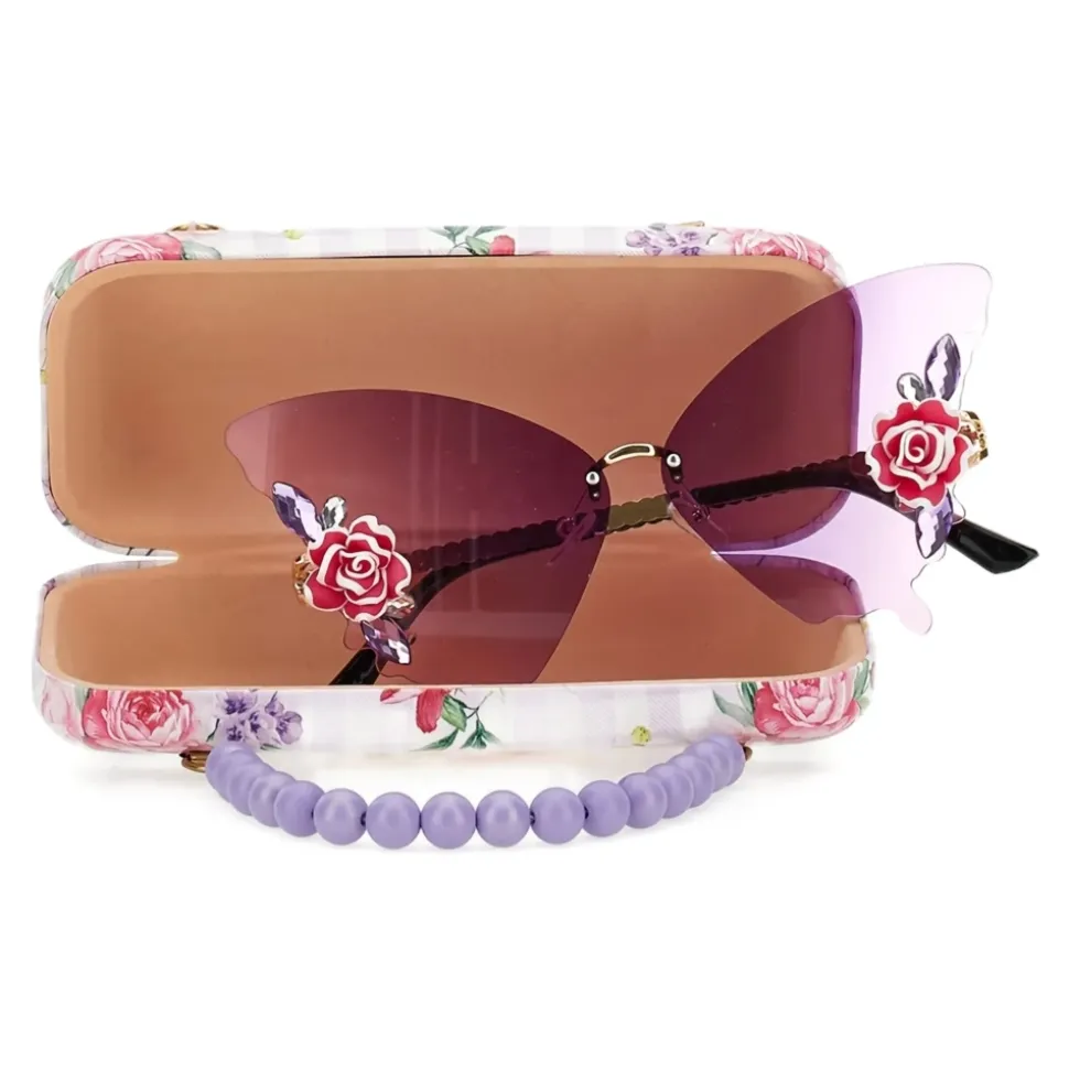 Monnalisa Occhiali Farfalla er sommerfugleformede solbriller, der tilføjer en legende silhuet til hverdagsoutfits. Den karakteristiske sommerfuglestel gør dem til et stilfuldt valg af solbriller. Vigtige egenskaber: Lilla | Glicine | Sommerfugleformet stel