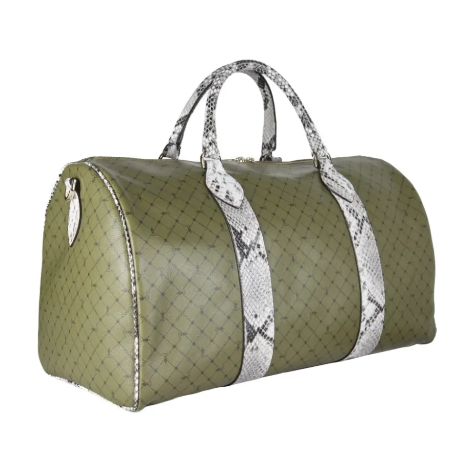 Præsenterer det seneste tilføjelse til Trussardi-kollektionen, denne monogrammede hamrede kalveskind weekendtaske med øgletrykt læderdetaljer er perfekt til den modebevidste kvinde. Den olivengrønne farve, suppleret med creme- og brune accenter, giver den et lyst og alsidigt udseende. Med generøse dimensioner på 30 cm i højden, 45 cm i længden og 23 cm i bredden, og en aftagelig skulderrem (117 cm lang) i trykt læder, skaber den den perfekte blanding til et glamourøst look, selv når du rejser eller er i fitnesscentret. Alle håndtag og skulderrem-detaljer har metalliske finish, der tilføjer et strejf af lysstyrke til denne fremragende made in Italy-taske.