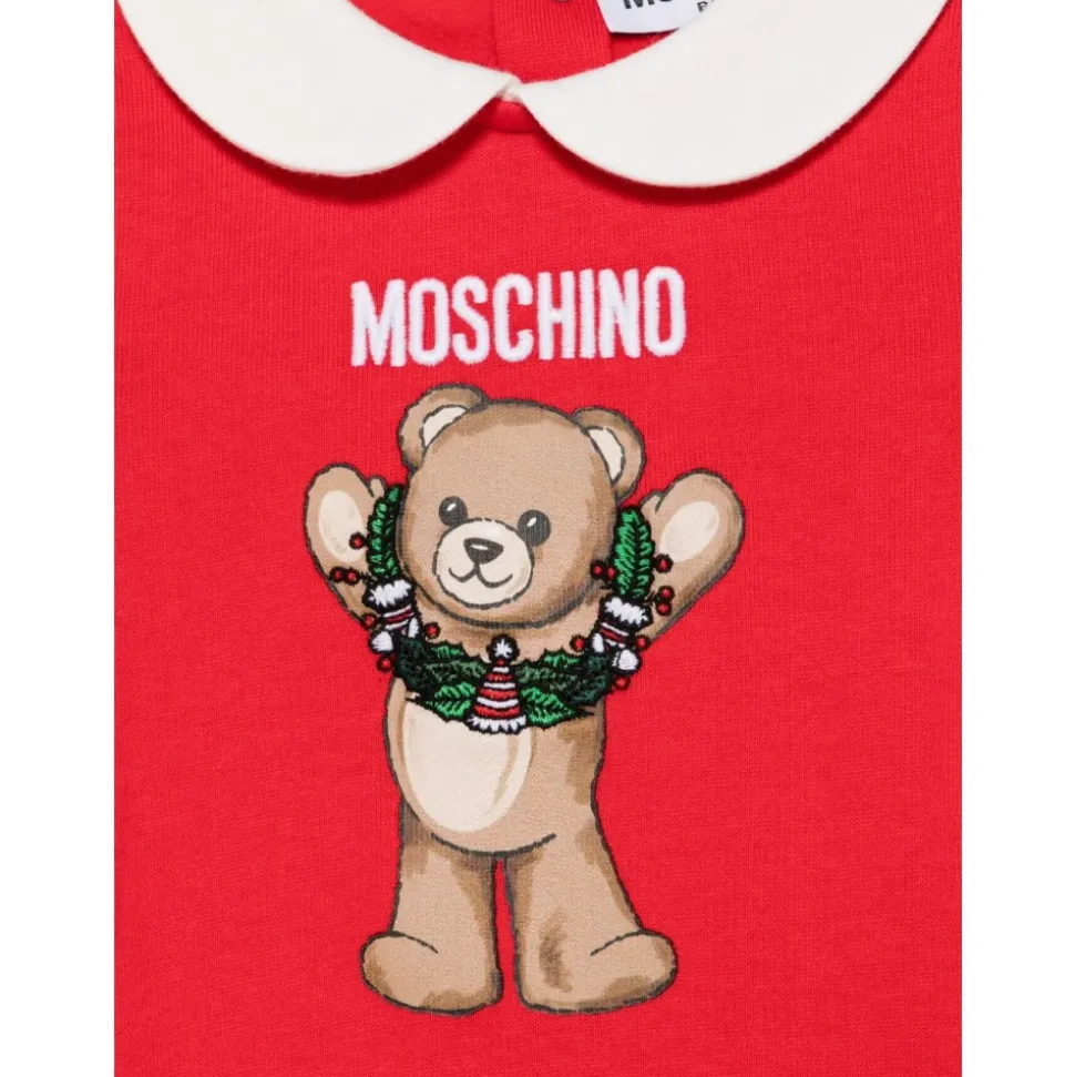 Moschino Peter Pan Collar Teddy Body kombinerer legende teddy-print detaljer med en klassisk rund krave. Lange ærmer og en knaplukning gør den nem at lagdele og style til hverdagsbrug. Nøgleattributter: Rød | Knaplukning | Peter Pan krave | Teddy print | Lange ærmer