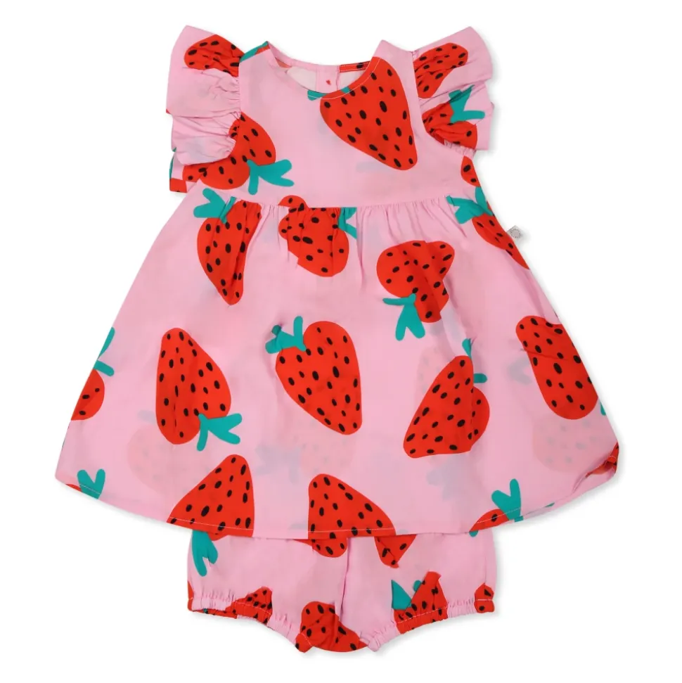 Klæd din lille pige stilfuldt på med dette Stella McCartney lyserøde sæt. Sættet inkluderer en lyserød kjole med korte rynkede ærmer, en rund halsudskæring og knapper på bagsiden, parret med matchende culottes. Prydet med søde jordbær over det hele, er dette sæt lavet af en blanding af viskose og lyocell. Plejeinstruktioner: Maskinvask ved 30°C.