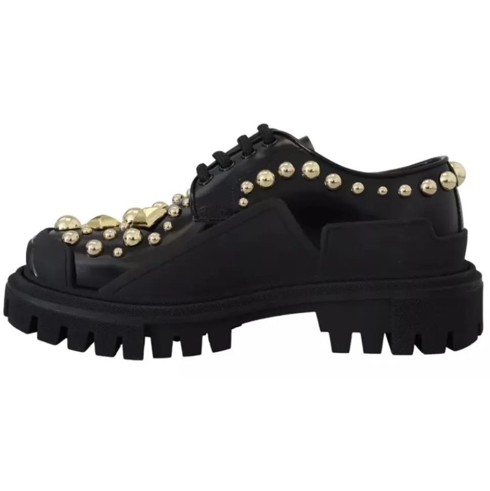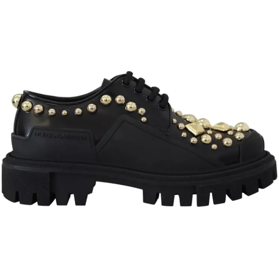 Dolce & Gabbana Poleret kalveskinds Trekking Derby kombinerer en chunky trekkingsål med en guldbesat tå, hvilket giver et pyntet outdoor-look med raffinerede detaljer. Vigtigste egenskaber: Sort | Læder | Meget høj komfort | Snørelukning | Revers-stil gummi sideindsatser | Chunky slidbanesål | Gulddetaljer på tå | Poleret læderfinish | Logo detaljer | Sammensætning & pleje: 100% Læder