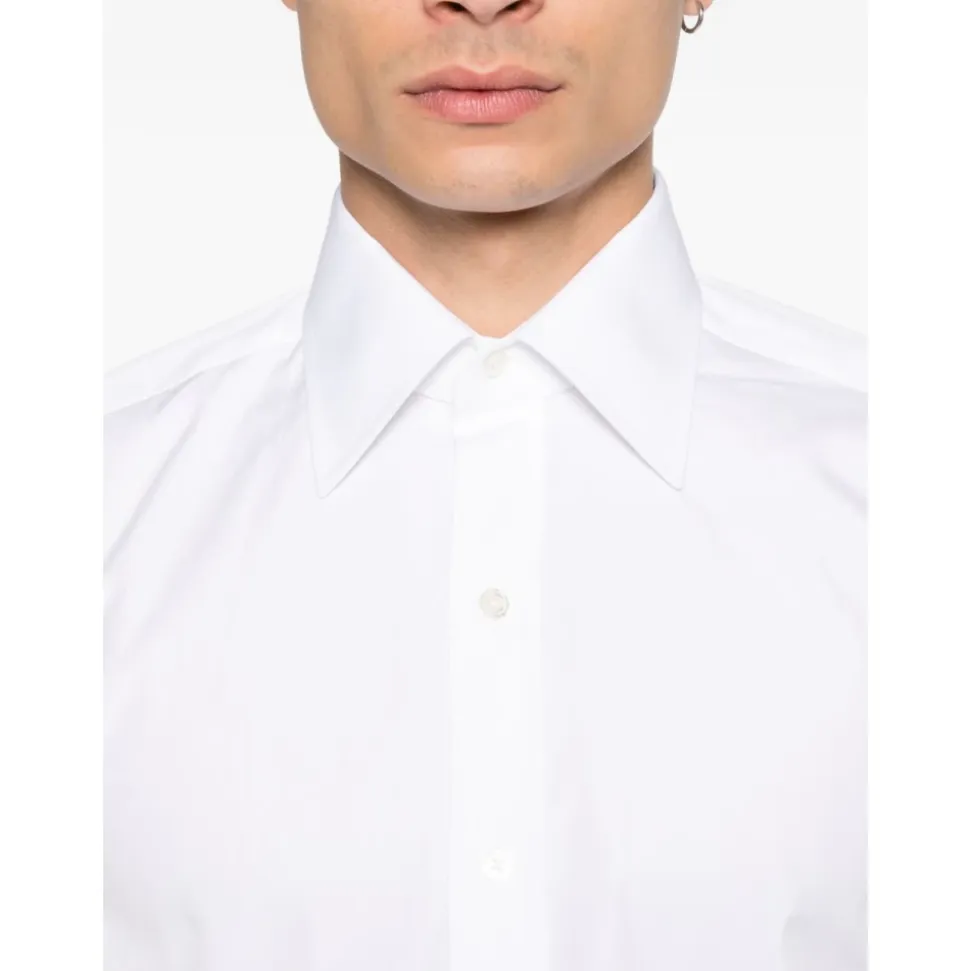 Tom Ford Poplin Classic Fit Shirt er en raffineret hvid bomuldspoplin skjorte designet til formel brug og forretningsbrug. Den har en klassisk krave og tøndemanchetter for et poleret, tidløst look. Vigtige egenskaber: Hvid | Bomuldspoplin | Knaplukning foran | Knapmanchetter | Klassisk krave | Tøndemanchetter | Garnfarvet fin poplin | Dimensioner & pasform: Klassisk pasform | Sammensætning & pleje: 100% bomuld | Maskinvask