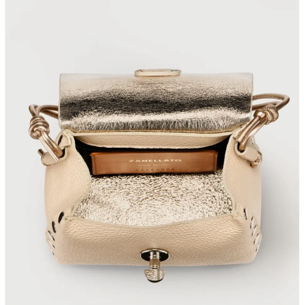 Zanellatos Postina Super Baby er en kompakt mini-skuldertaske, der kombinerer hamret, lamineret kalveskind med markante metaldele for et metallisk, city-klart look. Ideel til håndfri brug fra dag til aften takket være den justerbare rem. Vigtige egenskaber: Pink Dalia | Kalveskind | Lamineret læderfinish | Tekstureret (hamret) overflade | Justerbar skulderrem | Top håndtag | Drejelås-lukning | Indvendig stiklomme | Hamret/lamineret læderfinish | Metaldele | Kompakt rektangulær silhuet | Nittedetaljer | Klap med drejelås | Mål og pasform: Bredde 16 cm | Højde 14 cm | Dybde 11 cm | Håndtagshøjde 5 cm | Mini/kompakt størrelse | Justerbar rem til skulder- eller crossbody-brug | Sammensætning og pleje: Ydre: 100% kalveskind | Foring: 100% polyester | Aftørres med en blød, let fugtig klud. Undgå længerevarende udsættelse for vand og direkte varme. Opbevares i en støvpose og plejes sparsomt; test altid ethvert produkt på et ikke iøjnefaldende område først.