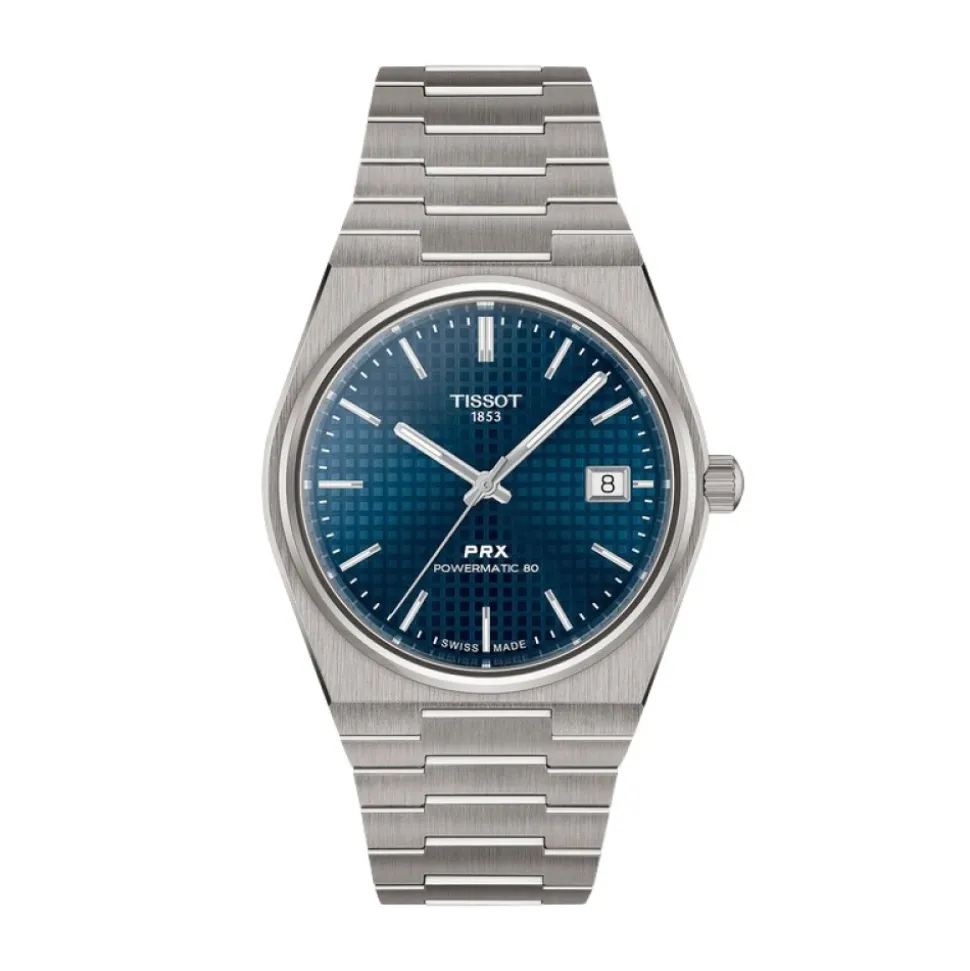 Tissot PRX Powermatic 80 Titanium 38mm kombinerer en letvægts titaniumkonstruktion med en slank, ’70’er-inspireret sportsprofil. Den er bygget til hverdagsbrug og lang automatisk ydeevne med en 80-timers gangreserve. Vigtige egenskaber: Blå | Grå | Titanium | Vandafvisende til 10 bar (100 m / 330 ft) | Powermatic 80 automatisk urværk – 80-timers gangreserve | Ridsefast safirkrystal | Udskiftelig quick-release lænke | Butterfly-lås med trykknapper | Udstillingsbagkasse (gennemsigtig) | Integreret lænke med vinklede led | Datovisning klokken 3 | Tønneformet urkasse | Påførte selvlysende timemarkører | Dimensioner og pasform: Urkassediameter: 38,00 mm | Urkassetykkelse: 10,9 mm | Sammensætning og pleje: Titanium (urkasse og lænke) | Safirkrystal | Aftørres med en blød klud; undgå udsættelse for kemikalier og stærke magnetfelter; betjen ikke kronen under vand; få den serviceret af et autoriseret servicecenter.