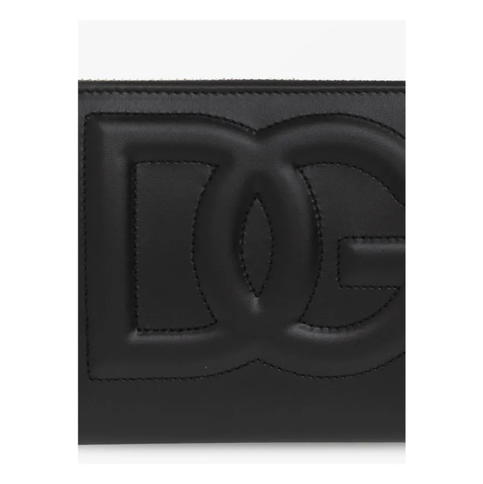 Sort pung fra Dolce & Gabbana. Fremstillet af kalveskind, dette design har lynlåslukning hele vejen rundt, en forhøjet logo på forsiden og tre pengeseddelrum, en lynlåsmøntpung, to lommer og tolv kortspalter indeni.