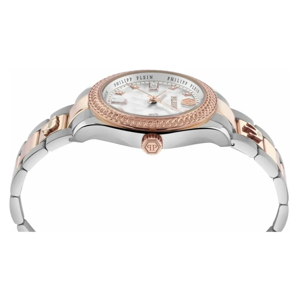 Philipp Plein Queen Crystal PWCDA0724 kombinerer et tofarvet design i rustfrit stål med funklende krystalindeksmarkeringer for et elegant hverdagslook. Nøgleattributter: Grå | Sølv | Rustfrit stål | Vandafvisende op til 5 ATM | Præcis kvartstidtagning | Kvarts urværk | Tofarvet design (sølv og rosaguld) | 11 krystalindeksmarkeringer | Guilloché-skive | Dimensioner og pasform: 38 mm urkassediameter | Perfekt proportioneret til mindre håndled | Sammensætning og pleje: Rustfrit stål