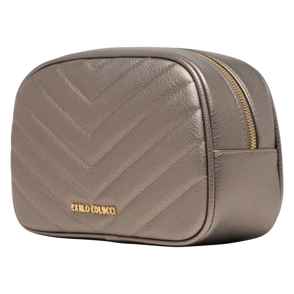 Denne quiltede toilettaske fra Carlo Colucci kombinerer stil og funktionalitet perfekt. Den har et sofistikeret quiltet mønster, der skaber et moderne og elegant look. Indvendigt tilbyder tasken rigelig plads til alle dine kosmetik- og plejeprodukter. Den robuste lynlås beskytter dine genstande sikkert, og den kompakte størrelse gør den til den ideelle ledsager til rejser eller daglig brug. Et stilfuldt tilbehør, der tilføjer en luksuriøs touch til enhver plejerutine.