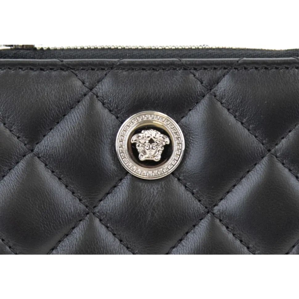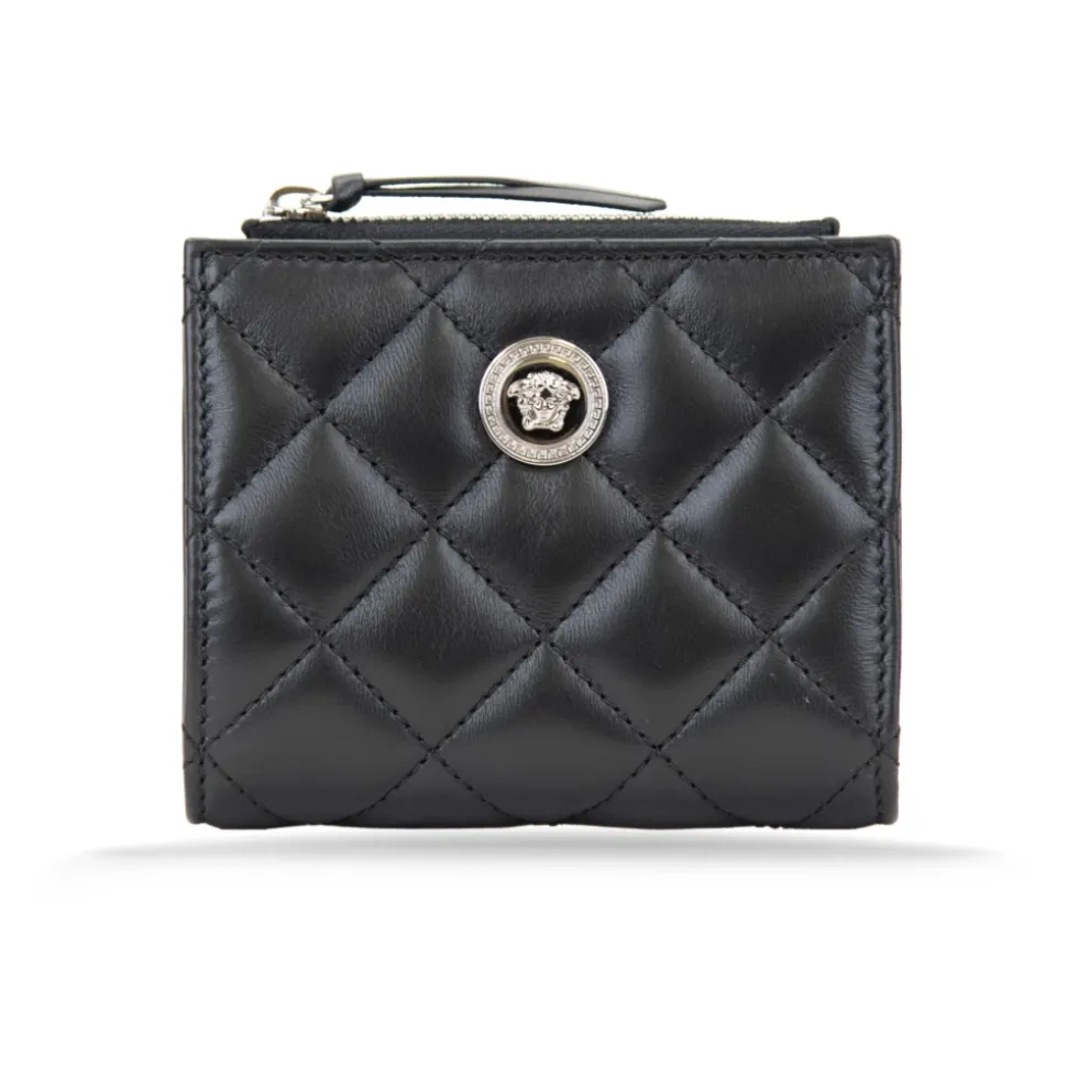 Forkæl dig selv med denne luksuriøse damepung fra Versace. Lavet af quiltet læder med et elegant sølvfarvet metallogo på forsiden. Produceret i Italien, denne pung har en møntlomme, kortlommer og lynlåslukning. Mål: B11cm x H9cm x D3cm.