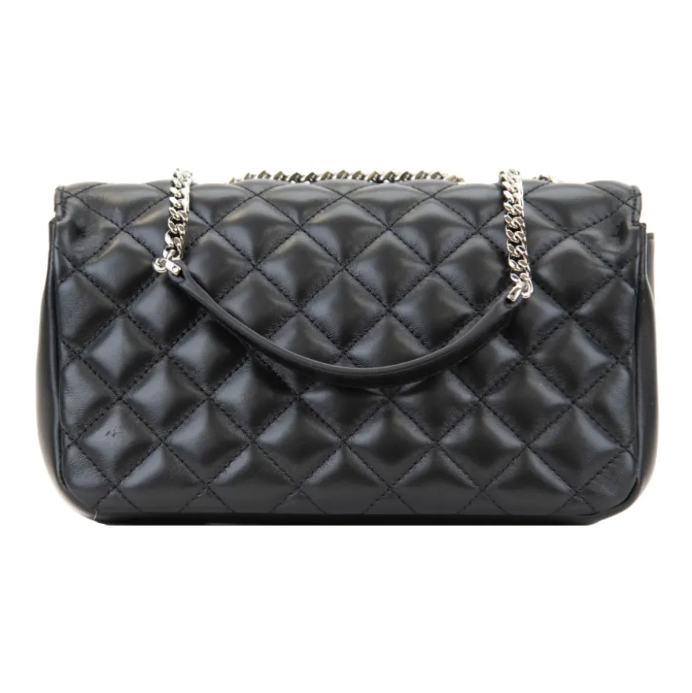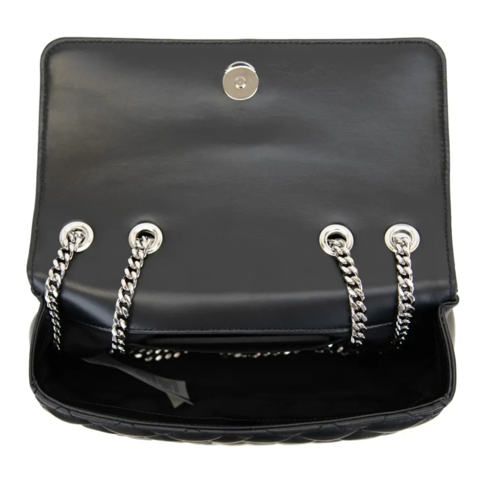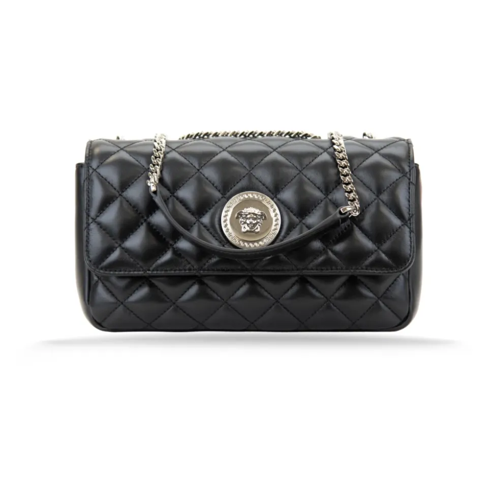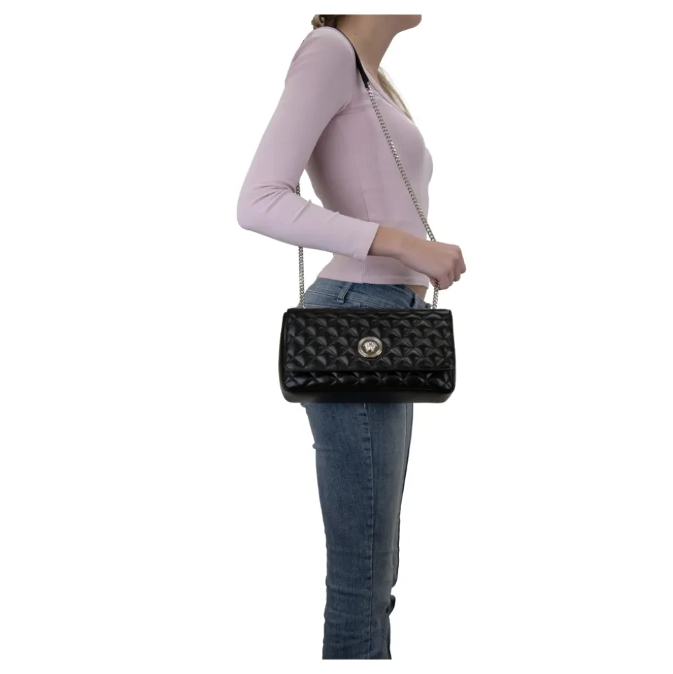 Forkæl dig selv med denne luksuriøse Versace skuldertaske til kvinder. Lavet af quiltet kalveskind, har den en rummelig indvendig med en sidelomme og et logo i læder. Den gyldne metal kæde skulderrem tilføjer en glamourøs touch, mens det sølvfarvede brandlogo på forsiden gør et statement. Produceret i Italien. Mål: B28,5cm x H16cm x D9,5cm.