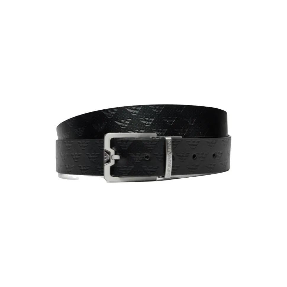 Armani reversibelt bælte i læder, designet til dobbelt brug med kontrasterende teksturer på hver side. Et alsidigt tilbehør, der skifter mellem en præget finish og en pebble finish med et logo spænde lukning. Nøgleattributter: Sort | Nero | Okse læder | Reversibelt design | Logo spænde med stiftlukning | Præget læder på den ene side | Pebble (palmellated) læder på den anden side | To-tekstur reversibel finish | Sammensætning & pleje: Okse læder