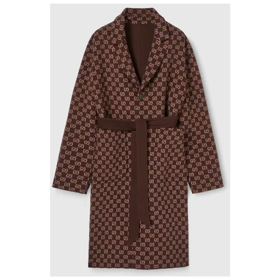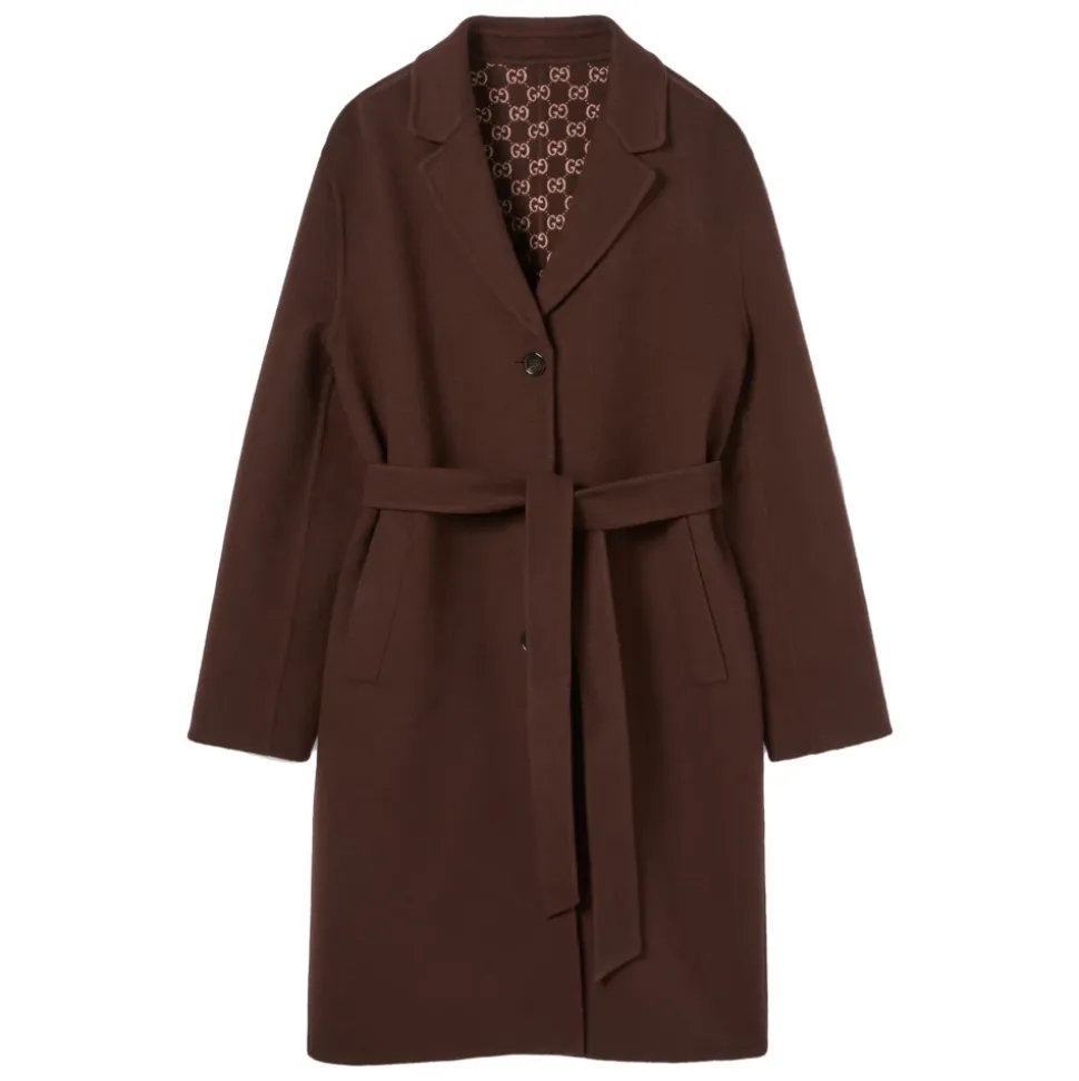 Gucci Reversible Silk Wool Coat tilbyder to forskellige looks i ét stykke, hvor du kan skifte mellem ensfarvet brun uld og silke og en brun/lyserød GG-motiv bagside. Den er designet til alsidighed og kombinerer skræddersyede detaljer med en vendbar dobbeltvævet konstruktion. Vigtigste egenskaber: Brun | Lyserød | Uld og silke | Vendbar | Uforet | Knaplukning | To sidelommer | Hakkrager | GG-motiv på bagsiden | Dobbeltvævet konstruktion | Sammensætning og pleje: 99% uld | 1% silke | Renseri