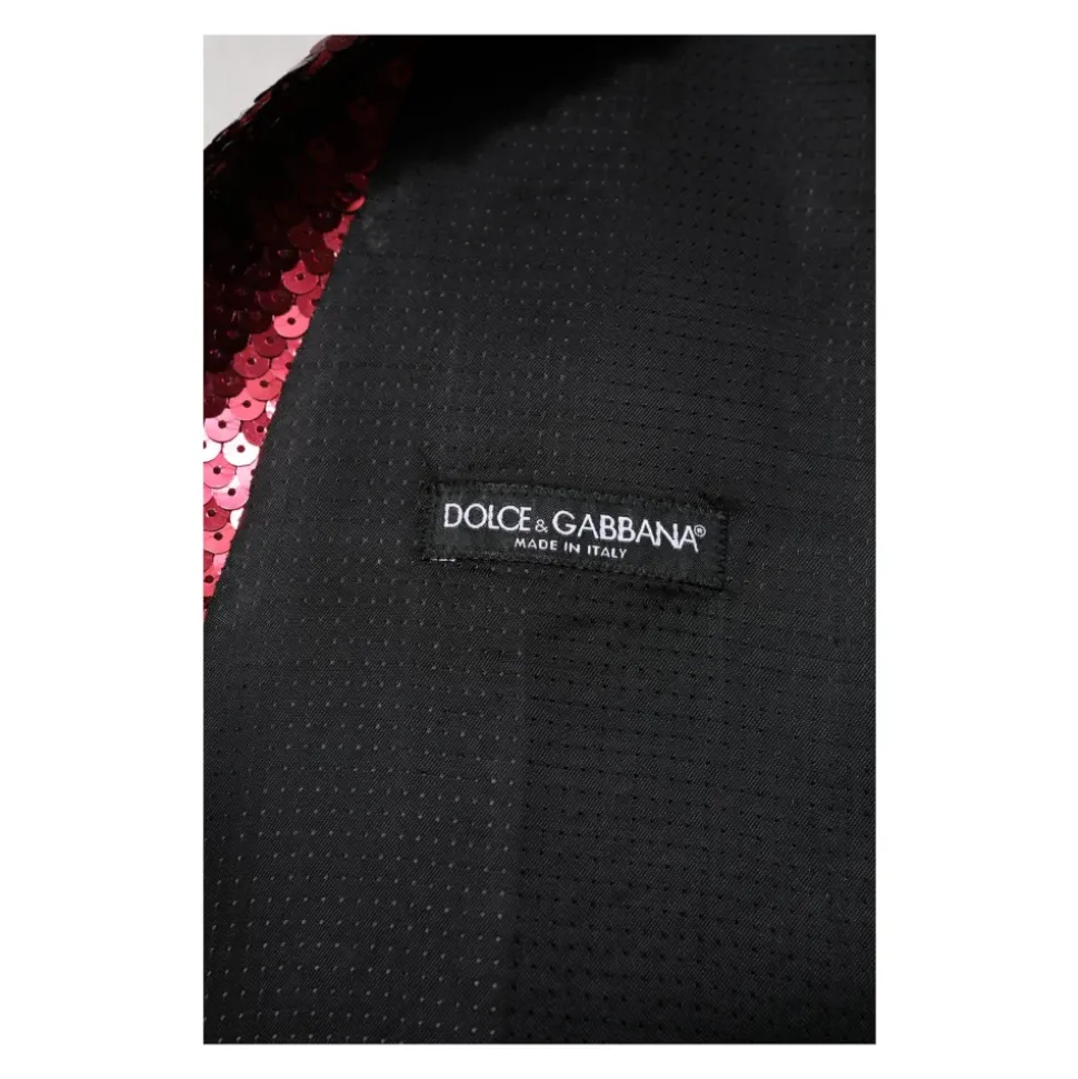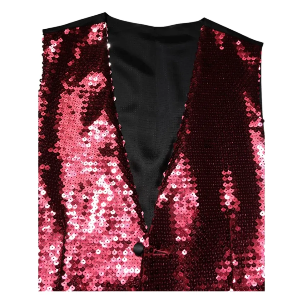 Forhøj din formelle garderobe med Dolce & Gabbana Red Sequined Dress Formal Men’s Waistcoat Vest. Denne italiensk-fremstillede vest har et enkeltknap design, justerbar taljerem og luksuriøst rødt pailletstof for et strejf af sofistikation. Lavet af en blanding af nylon, polyester, silke og elastan, tilbyder den både komfort og stil. Komplet med fuld knaplukning foran og signaturlogo detaljer, udstråler denne vest Dolce & Gabbana’s håndværksmæssige kvalitet.