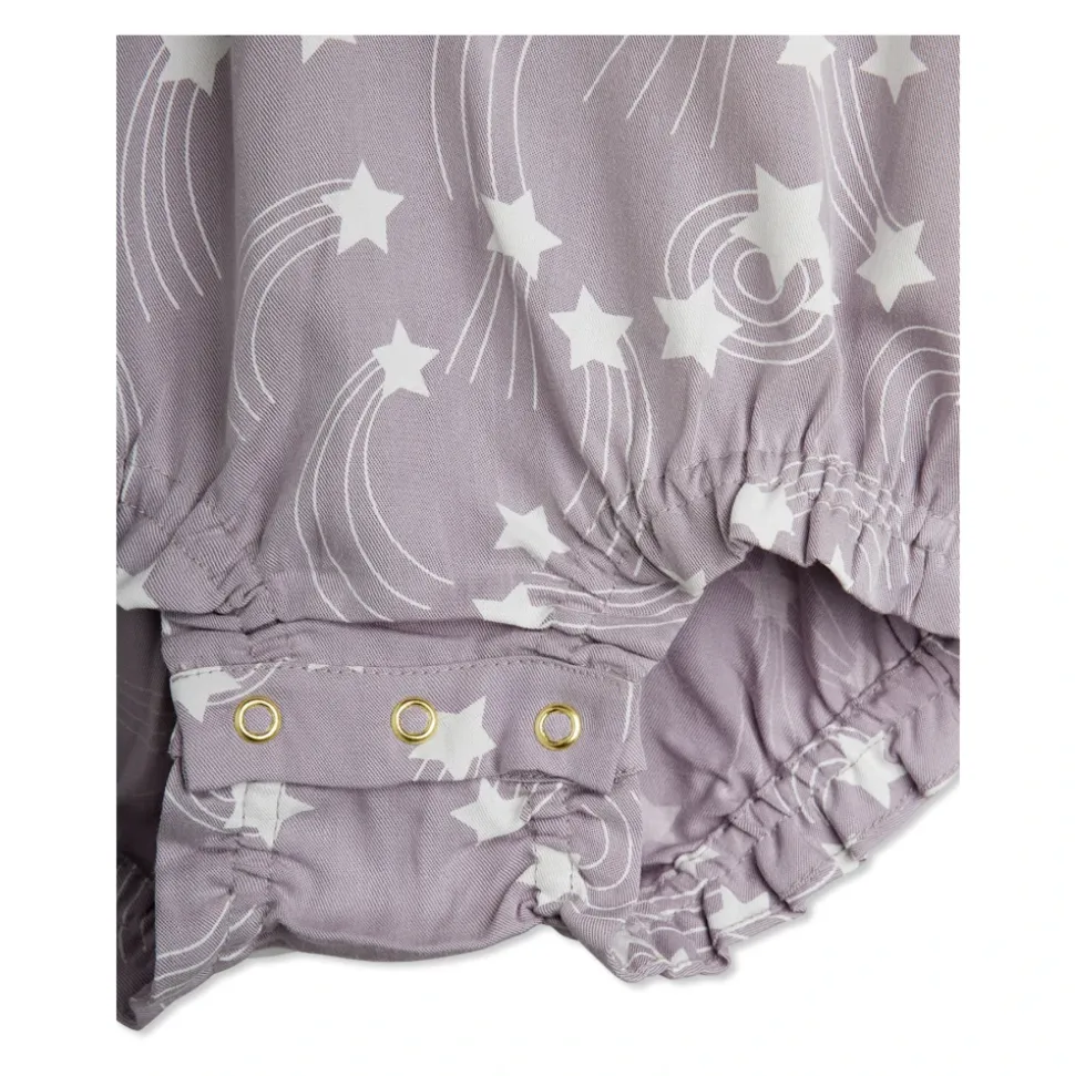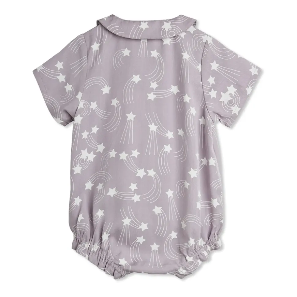 Mini Rodini Romper med print kombinerer et klassisk skræddersyet snit med blød, åndbar bomuld for behageligt hverdagsbrug. Nøgleattributter: Lilla | Bomuld | Åndbart stof | Blødt og skånsomt mod sart hud | Frontlukning for nem påklædning | Elastiske manchetter på ærmer og ben | Let at tage på | Peter Pan krave | Korte ærmer og ben | All-over stjerne- og skydelinjeprint | Dimensioner og pasform: Klassisk skræddersyet snit | Sammensætning og pleje: 100% bomuld | Maskinvask ved 40°C. Vask med vrangen ud. Må ikke bleges. Lufttørre.