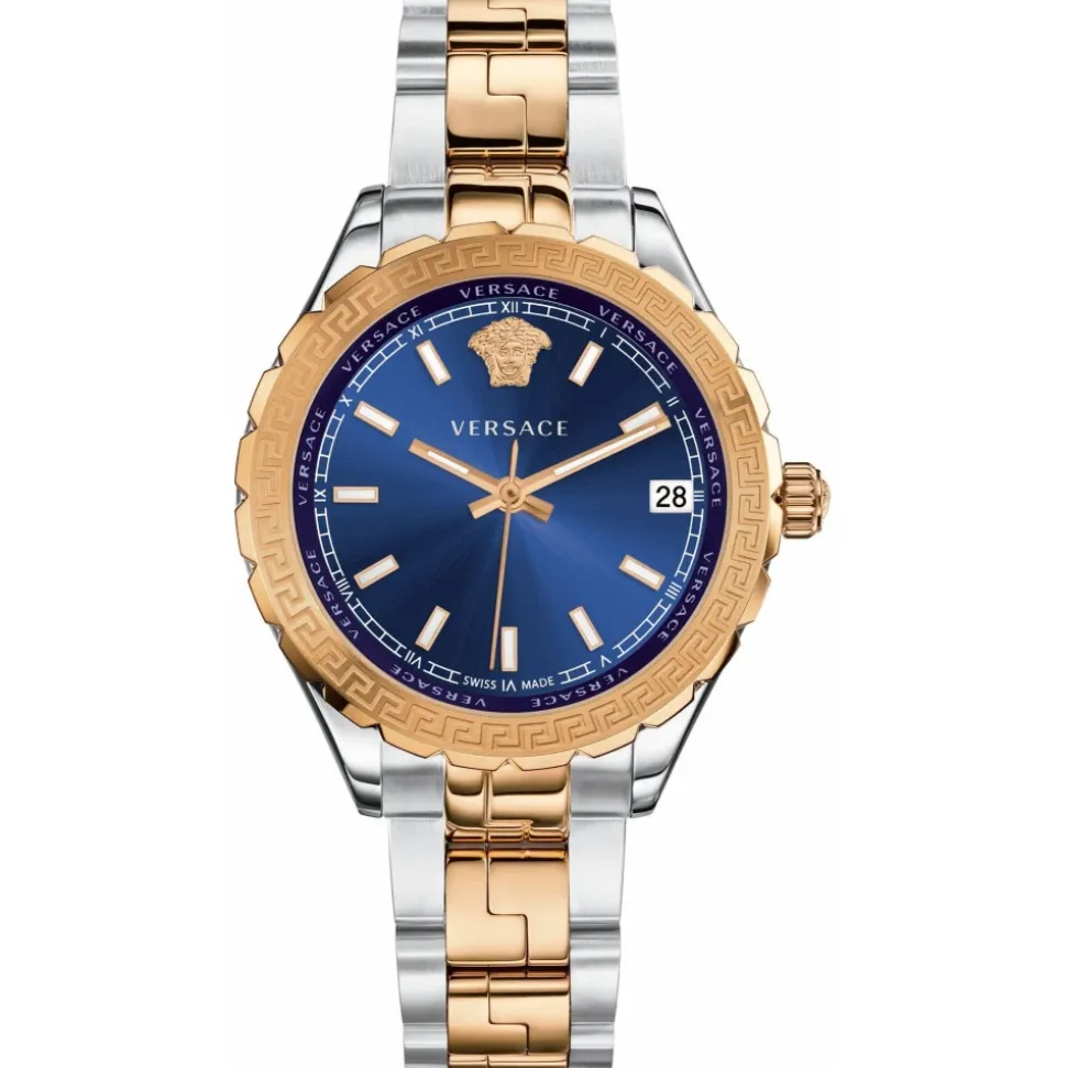 Forhøj din stil med dette fantastiske Versace dameur. Med en analog visning med datofunktion, kvartsur, safirglas og en smuk blå urskive. Det 35 mm rustfri stålkasse i sølv og rosaguld komplimenterer stålbåndet i sølv og rosaguld. Vandafvisende op til 5 Bar. Produceret i Schweiz.