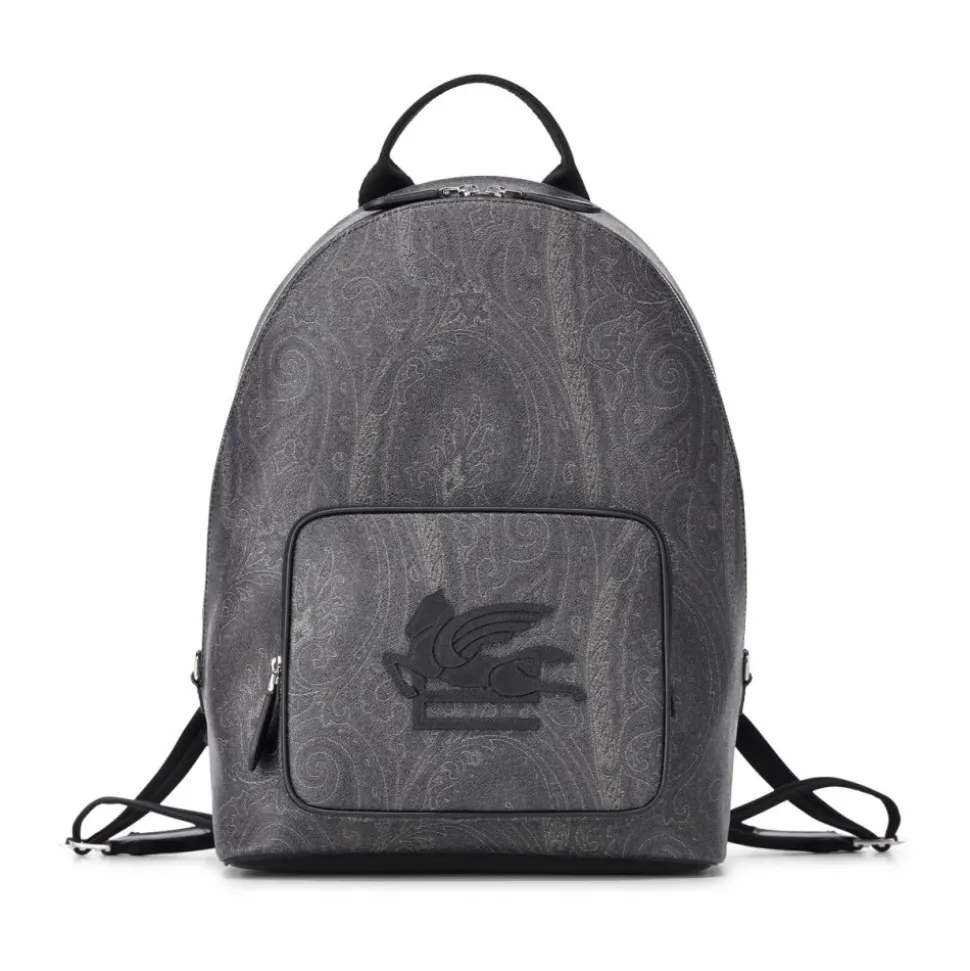 Etro rygsæk i paisley jacquard med læderdetaljer. Den har Pegaso-broderi og logoindprægning, der kombinerer stil med praktiske lommer og justerbare stropper til hverdagsbrug. Vigtigste egenskaber: Sort | Schwarz | Paisley jacquard | Justerbare skulderstropper | Tovejs lynlåslukning | Forlomme | Indvendigt rum | Metalbeslag i guldfarve | Paisley jacquard mønster | Pegaso-broderi foran | Logoindprægning bagpå | Læderkant | Guldfarvede metalbeslag | Mål & pasform: 31 x 42 x 18 cm | Sammensætning & pleje: Paisley jacquard | Læder