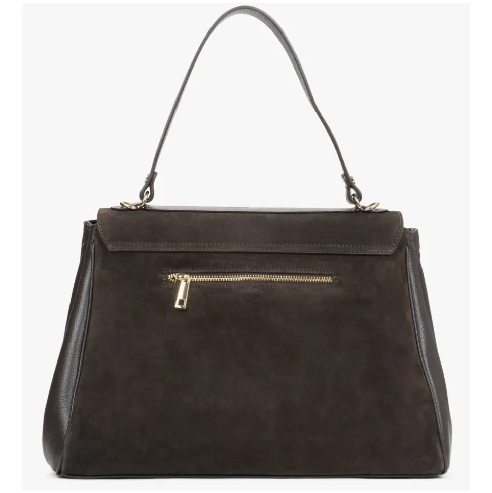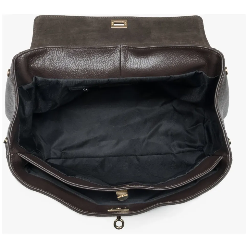 Estro Saddle Satchel Bag kombinerer førsteklasses italiensk velour og læder for en raffineret, organiseret taske, der er velegnet til både hverdagsbrug og særlige lejligheder. Nøgleattributter: Mørkebrun | Velour og læder | Holdbar konstruktion | Justerbar, aftagelig rem | To rum | To lommer | Spænde lukning | Inkluderer anti-dust pose | Saddle satchel silhuet | Guldfarvet hardware | Velour og læder finish | Dimensioner og pasform: Længde: 47 cm | Højde: 24 cm | Bredde: 10 cm | Håndholdt rem maks. længde: 46 cm | Skulderrem maks. længde: 100 cm | Håndholdt og skulderbæremuligheder | Sammensætning og pleje: Ægte italiensk velour | Ægte italiensk læder | Tekstilforing