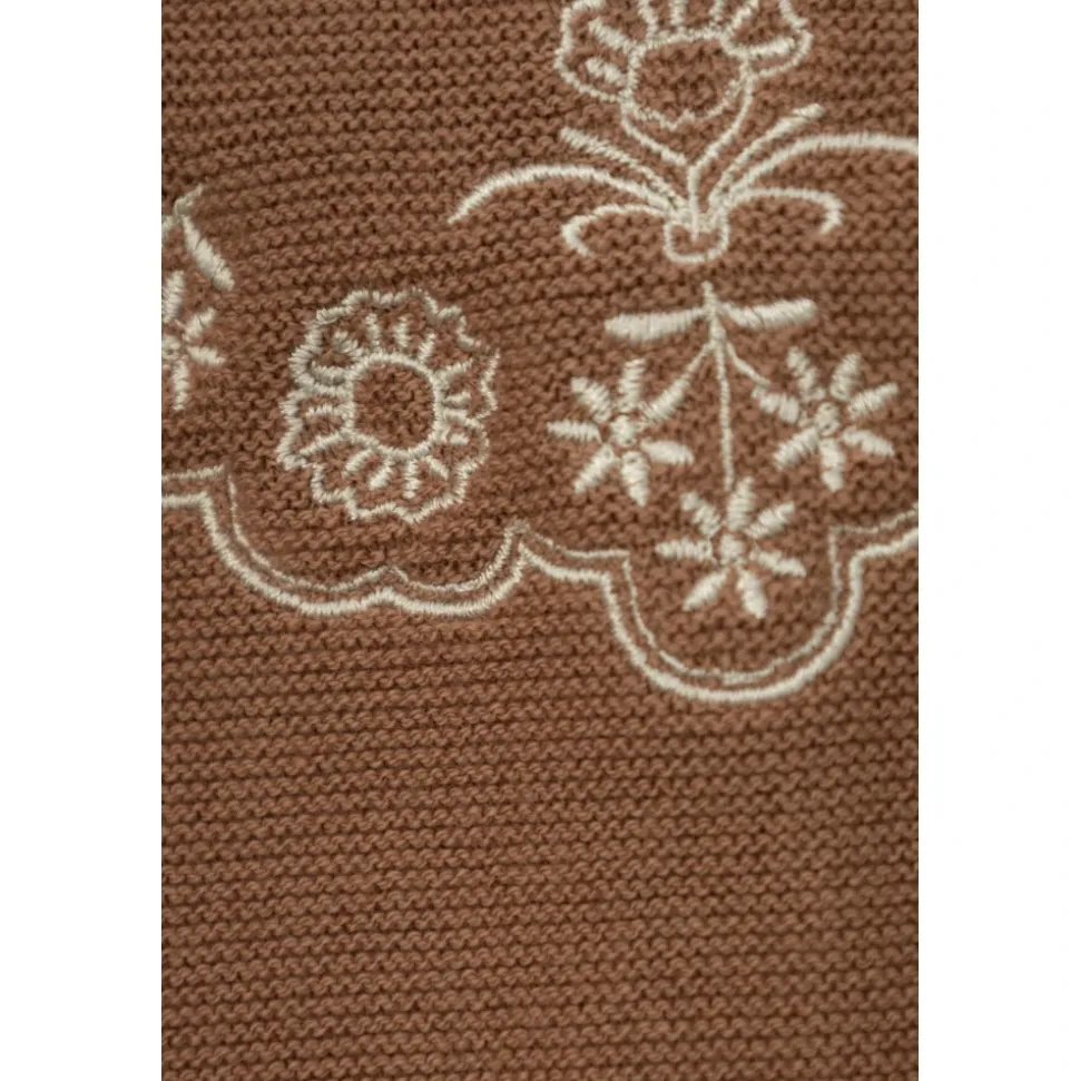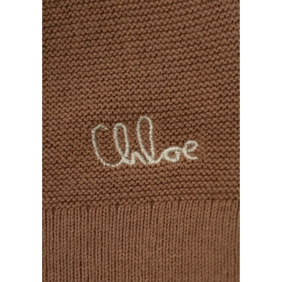 Chloés sæt med sovedragt og hat kombinerer en blød bomulds-cashmere strik med en kontrastfarvet rund krave og fine blomsterbroderier, hvilket giver hyggelig komfort og raffinerede detaljer til hverdagsbrug. Vigtige egenskaber: Brun | Bomuld og cashmere | Blød strik | Fløjlsagtig finish | Varm strik | Knaplukning bagpå | Dækkede fødder | Inkluderer matchende hat | Rund kontrastfarvet krave | Lange ærmer | Creme blomsterbroderi | Broderet logo | Sammensætning og pleje: 95% bomuld | 5% cashmere | Maskinvask ved 30°C.