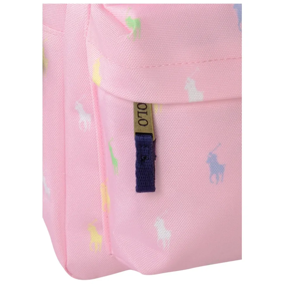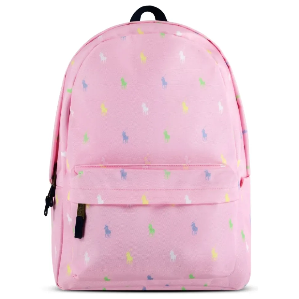 Lyserød Ralph Lauren rygsæk med all-over multicolor logo Levende og karakteristisk design: lyserød rygsæk dekoreret med Ralph Lauren-logo all-over i multicolor-version, for en frisk og munter stil. Holdbart materiale: lavet af robust stof for at sikre holdbarhed og modstand mod daglig brug. Funktionel og rummelig: stort hovedrum med lynlås og frontlomme til opbevaring af mindre genstande. Omhyggelige detaljer: lynlåse med brugerdefinerede træk og forstærkede syninger. Alsidig: perfekt til skole, sportsaktiviteter, ture eller fritid.