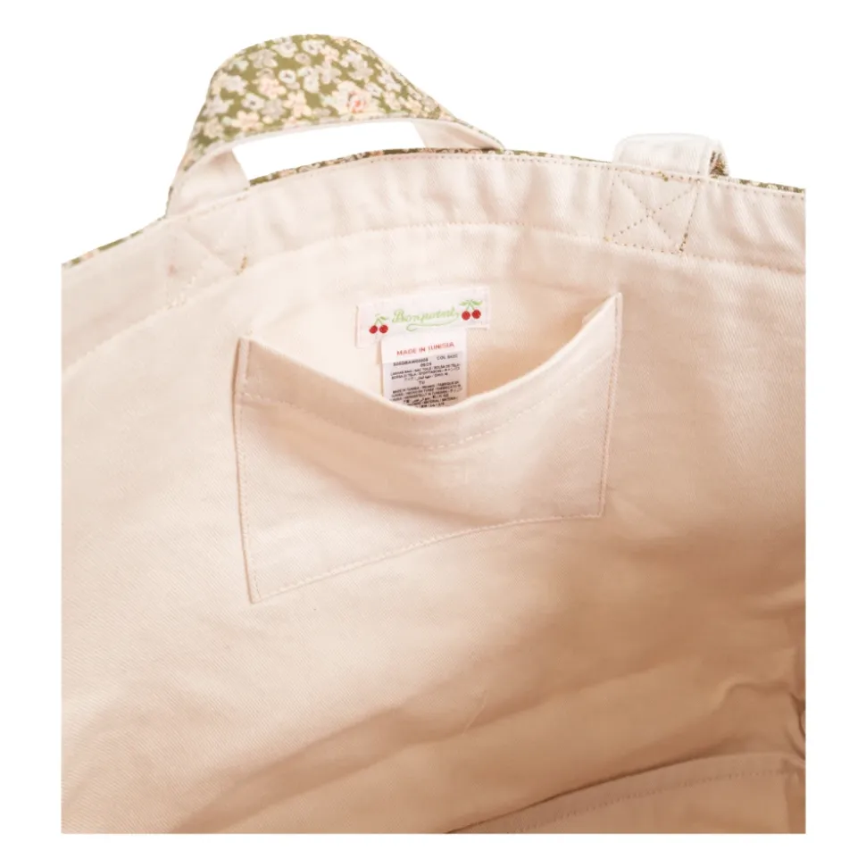 Bonpoint Shopper Taske er en bomuldstaske, der kombinerer en rummelig rektangulær form med et delikat blomstermotiv til hverdagsbrug. De lange, brede håndtag og den brede bund gør den praktisk til opbevaring og transport af daglige fornødenheder. Vigtige egenskaber: Beige | Bomuld | Holdbar bomuldskonstruktion | Rummelig rektangulær form | Bred bund for stor kapacitet | Lange, brede håndtag til hånd- eller skulderbæring | Let indvendig foring, nem at rengøre | Subtilt blomstermønster i pink, hvid og grøn | Rektangulær silhuet | Grafisk detalje foran | Mål & pasform: Højde: 28 cm | Bredde på bredeste sted: 35 cm | Bundbredde: 14 cm | Sammensætning & pleje: 100% Bomuld