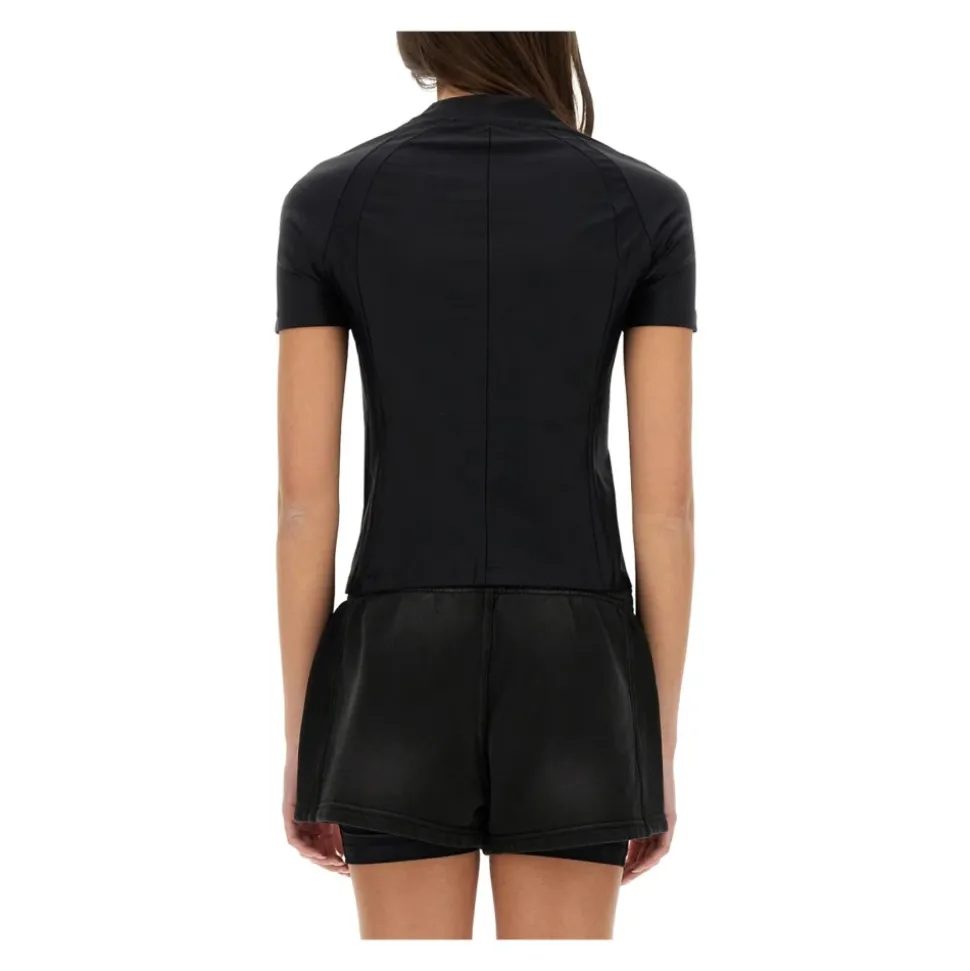 Alexander Wang Short Sleeve Rashguard Top tilfører en atletisk-inspireret silhuet med mock-neck til hverdags- og træningsbrug. Det strækbare nylon-elastan materiale og de strømlinede sømdetaljer giver en elegant, tætsiddende pasform med et sporty look. Vigtige egenskaber: Sort | Nylon | Strækbart materiale | Pull-on model | Mock neck | Korte ærmer | Raglanærmer | Atletisk-inspireret sømdetaljer | Logo ved halsudskæringen | Dimensioner og pasform: Slim fit | Sammensætning og pleje: 78% Nylon, 22% Elastan