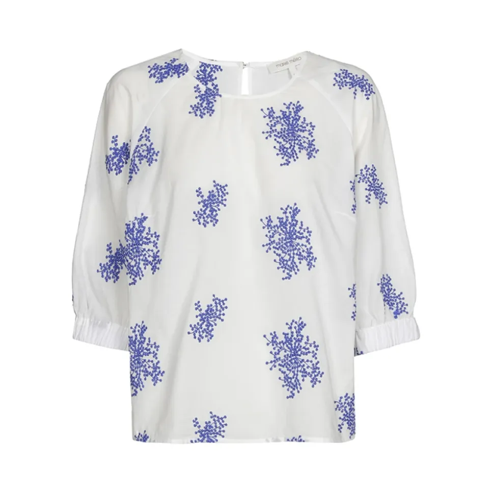 Marie Méro’s skjorte med broderede blomster kombinerer en rund hals med elastiske ærmer og blå blomsterbroderi for et friskt, feminint sommerlook. Style den med jeans eller en nederdel for et ubesværet, sommerligt outfit. Nøgleattributter: Hvid | Blå | Elastiske ærmer | Rund hals | Blå broderede blomster
