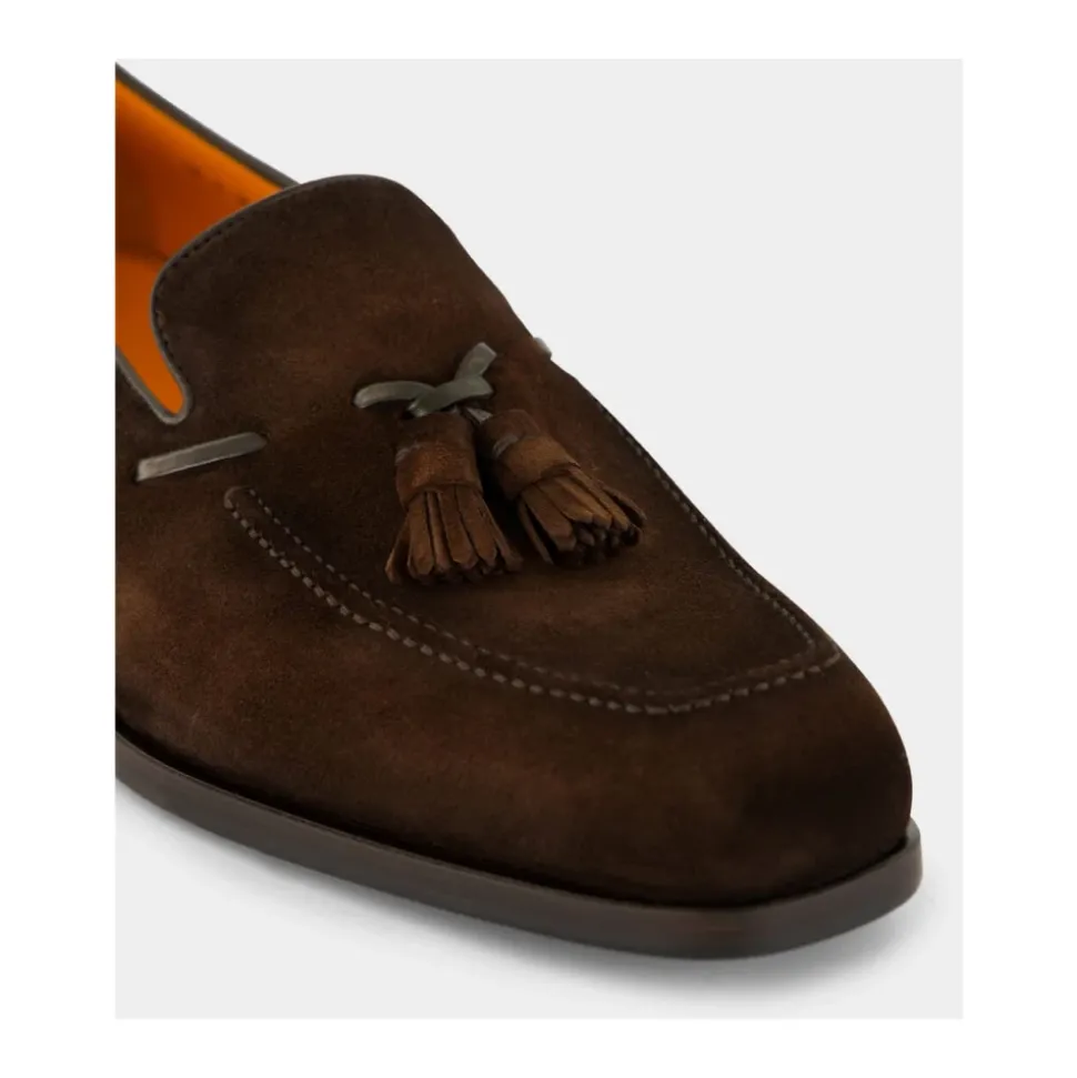Santoni sko i ruskind og læder med kvaster kombinerer italiensk håndværk med en markant firkantet tå. Skoene skiller sig ud med Santonis håndpåførte velatura-finish og raffinerede detaljer med kvaster og stikninger på overlæderet. Vigtigste egenskaber: Brun | Mørkebrun | Kalveskind | Firkantet tå | Håndsyede detaljer på overlæderet | Snørebånd i læder på siderne | Kvastdetaljer | Velatura farvegradient finish | Størrelse og pasform: Normal i størrelsen | Materiale og pleje: 100% kalveskind | Professionel læderrens