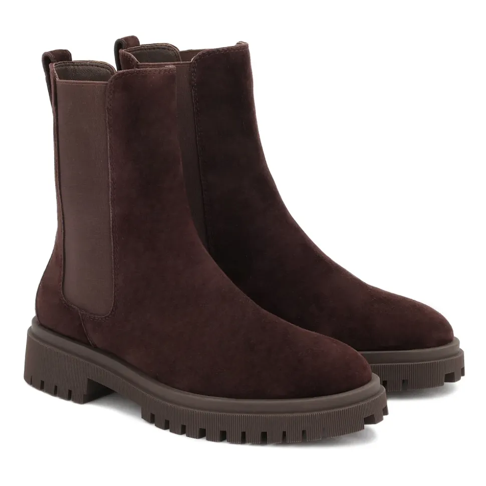 Slip-on Chelsea-støvler lavet af brunt ruskind er et tidløst forslag med et naturligt, sæsonbetonet udseende. Det bløde overlæder med en klassisk pasform er udstyret med elastiske sideindsatser, der sikrer behagelig påtagning og en perfekt pasform til foden. Fløjlsskindets tekstur i en dyb brun farve giver modellen en subtil elegance og universel karakter. Den karmoisinrøde sål med en markant mønster garanterer god greb og komfort til daglig brug. Dette er en model, der kombinerer stilfuld enkelhed med praktisk anvendelighed – perfekt til bymæssige og afslappede outfits til de koldere dage. Foret lavet af semianilin-fåreskind giver enestående komfort under brug takket være dets fremragende fugtabsorberende egenskaber.