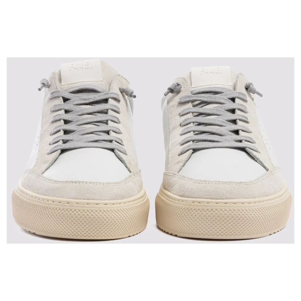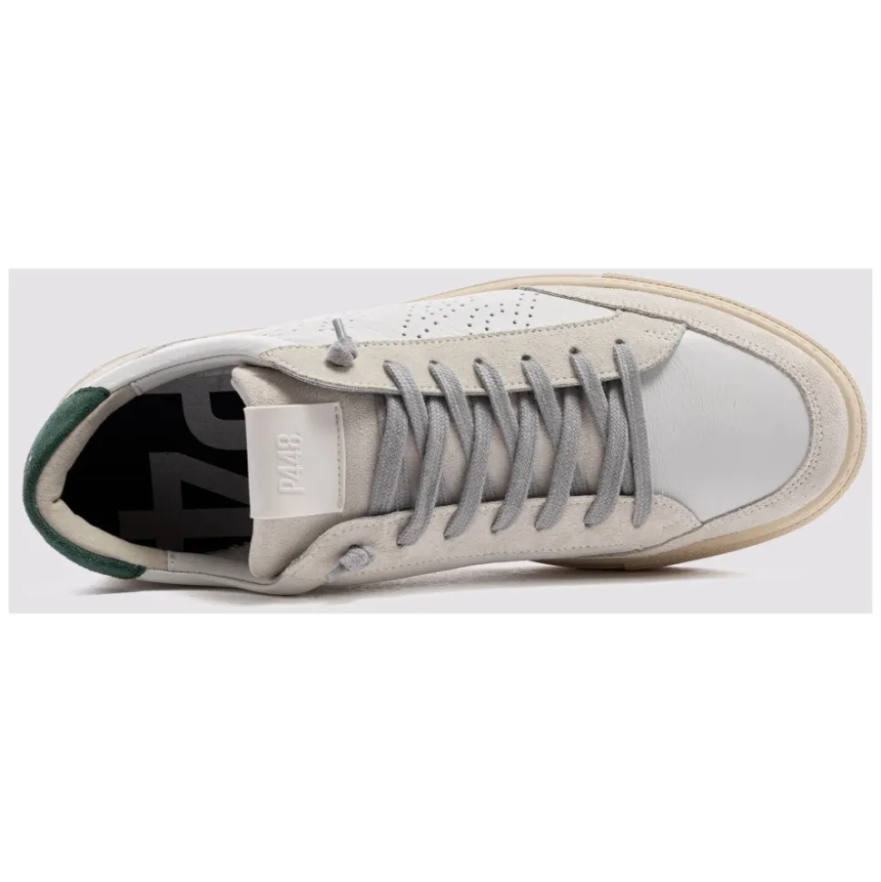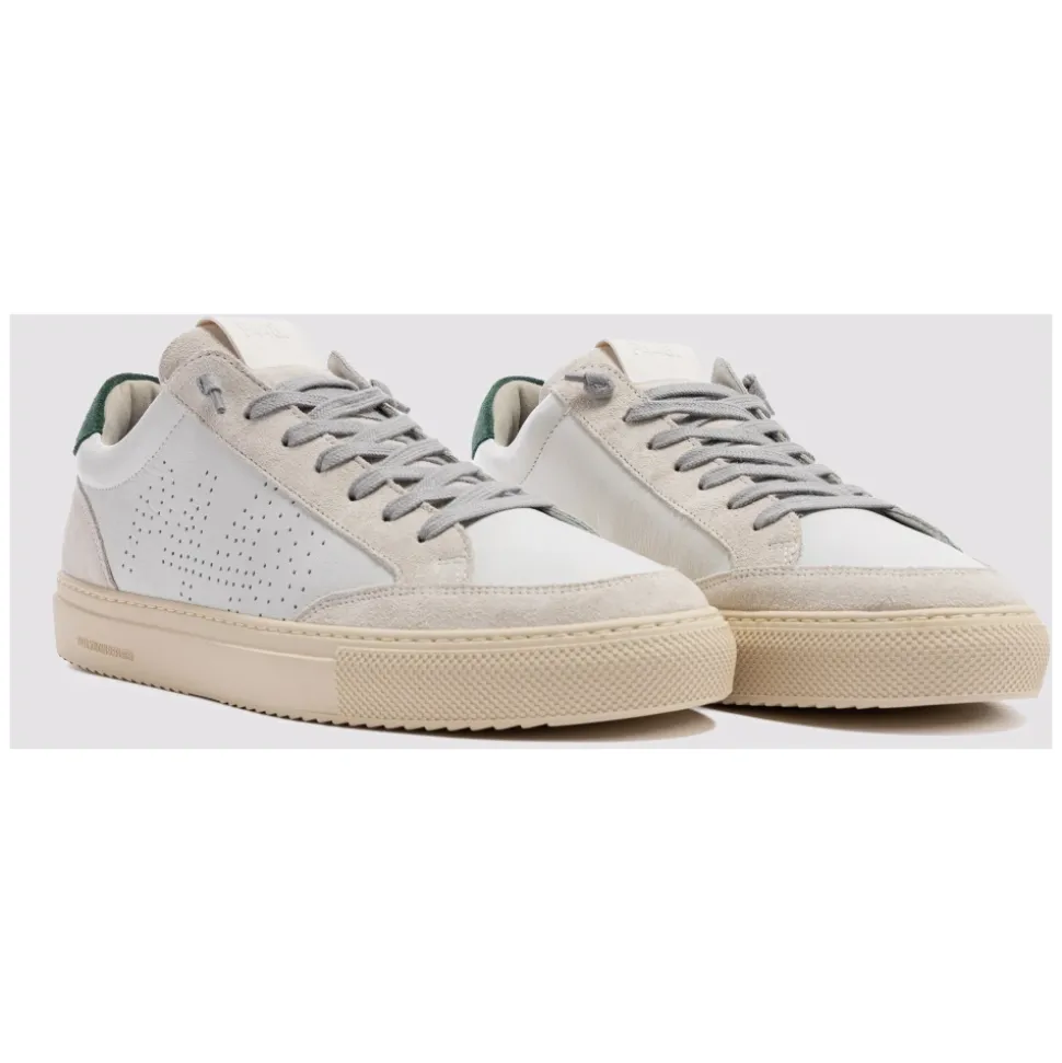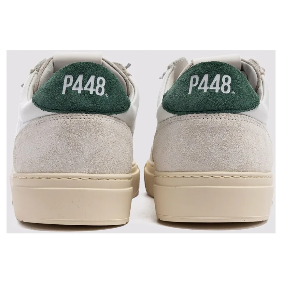 P448 Soho sneakers i en farveblokket læder- og ruskindskonstruktion, designet til hverdagsbrug med en karakteristisk P448 gummisål. Designet kombinerer en hvid og mørkegrøn palet med aftagelige snørebånd for at holde looket friskt. Vigtige egenskaber: Hvid | Grøn | Læder og ruskind | Sokforing for komfort | P448 gummisål for stødabsorbering | Grå bomuldssnørebånd inkluderet | Ekstra par hvide bomuldssnørebånd | Farveblokket læder og ruskind | Lav silhuet | Cremefarvet slidbane | Dimensioner og pasform: Normal i størrelsen | Sammensætning og pleje: Læder | Ruskind | Bomuld (snørebånd) | Gummi (sål)