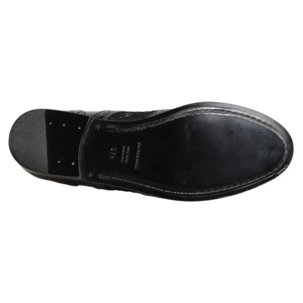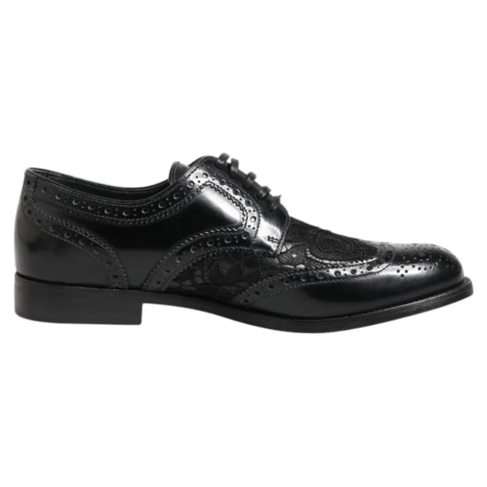 Forhøj din stil med disse smukke Dolce & Gabbana derby sko. Fremstillet af luksuriøst sort læder med blomsterblonde detaljer, disse autentiske italienske sko har en klassisk snørelukning og en feminin silhuet. Perfekt til formelle lejligheder eller tilføje flair til ethvert outfit. Fremstillet i Italien med høj håndværksmæssig kvalitet.