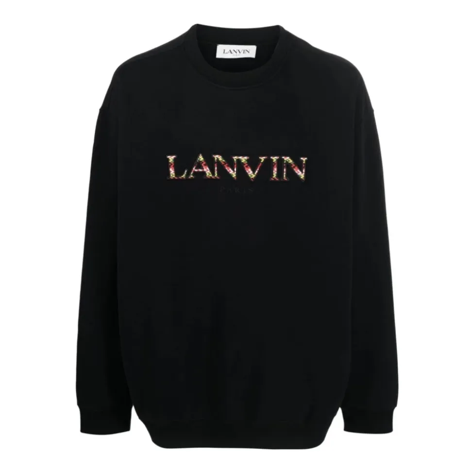 Fremhæv din stil med Lanvin Logo Curb Sweatshirt. Lavet af 100% bomuld, denne sorte sweatshirt har lange ærmer, ribbede kanter og en broderet logo detalje. Perfekt til afslappede ture eller afslapning derhjemme. Få din nu og skil dig ud i komfort og stil!