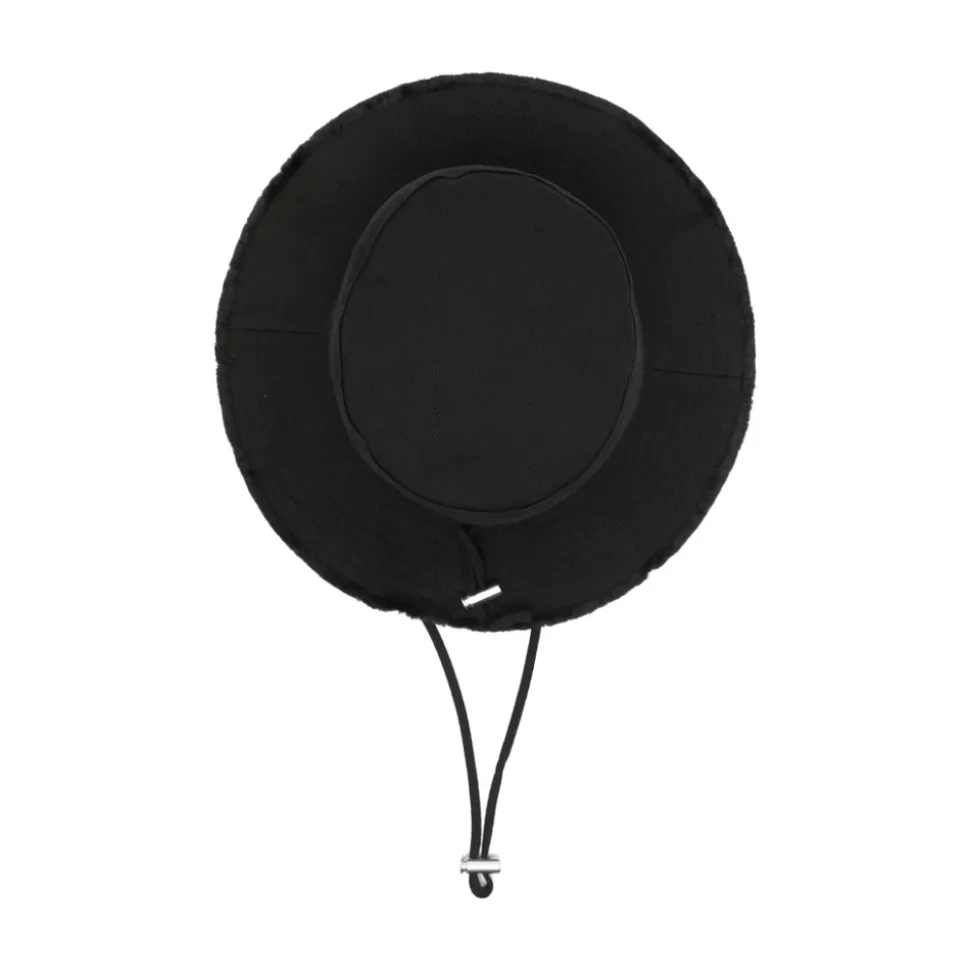 Fremhæv din stil med denne sorte Jacquemus hat med frynset kant, flad krone, snørelukning og logo-tekst. Kanten måler 7,5 centimeter med en omkreds på 58,0 centimeter. Perfekt til den modebevidste kvinde.