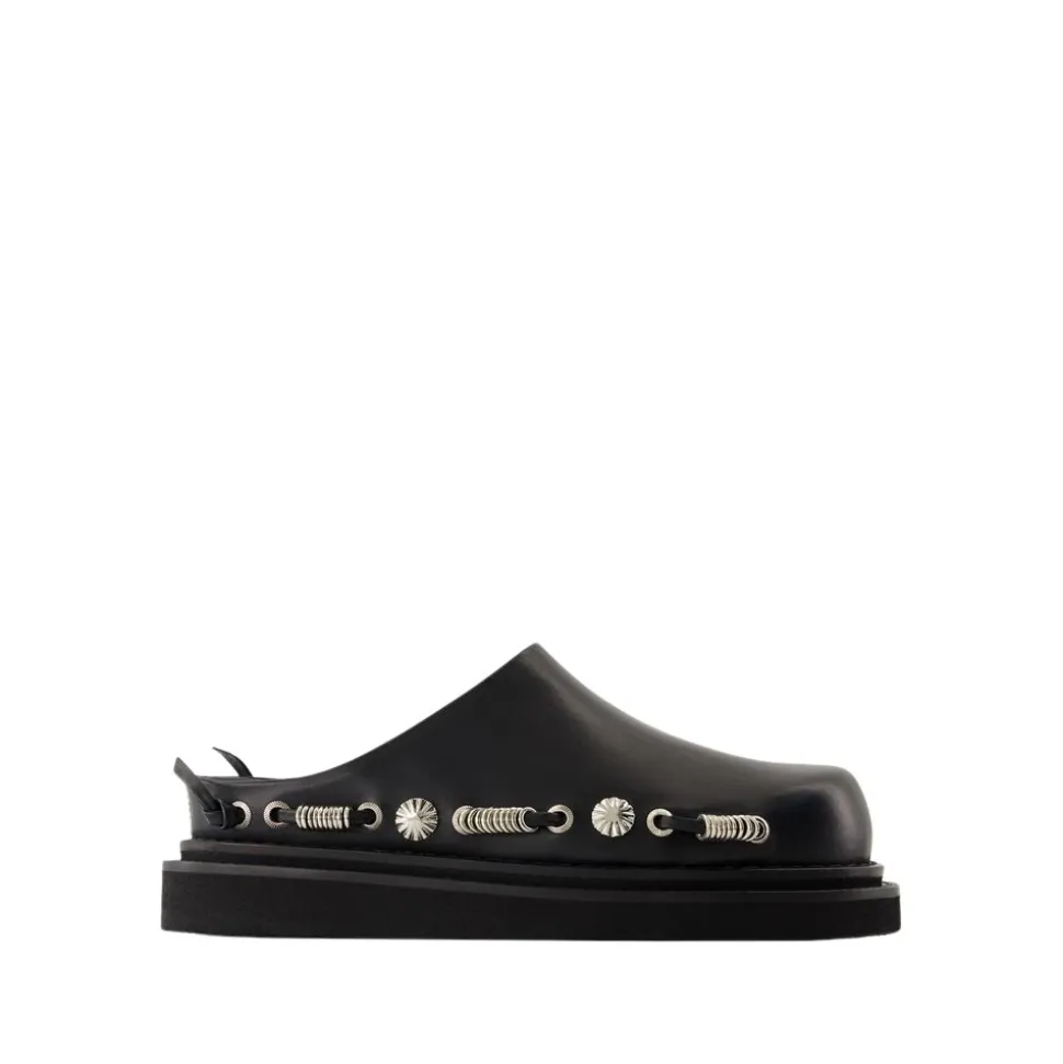 Forkæl dig selv med disse Toga Pulla flade mules i glat sort kalveskind. Med en rund tåform og en behagelig pasform i sand størrelse er disse franske sko perfekte til den moderne kvinde.