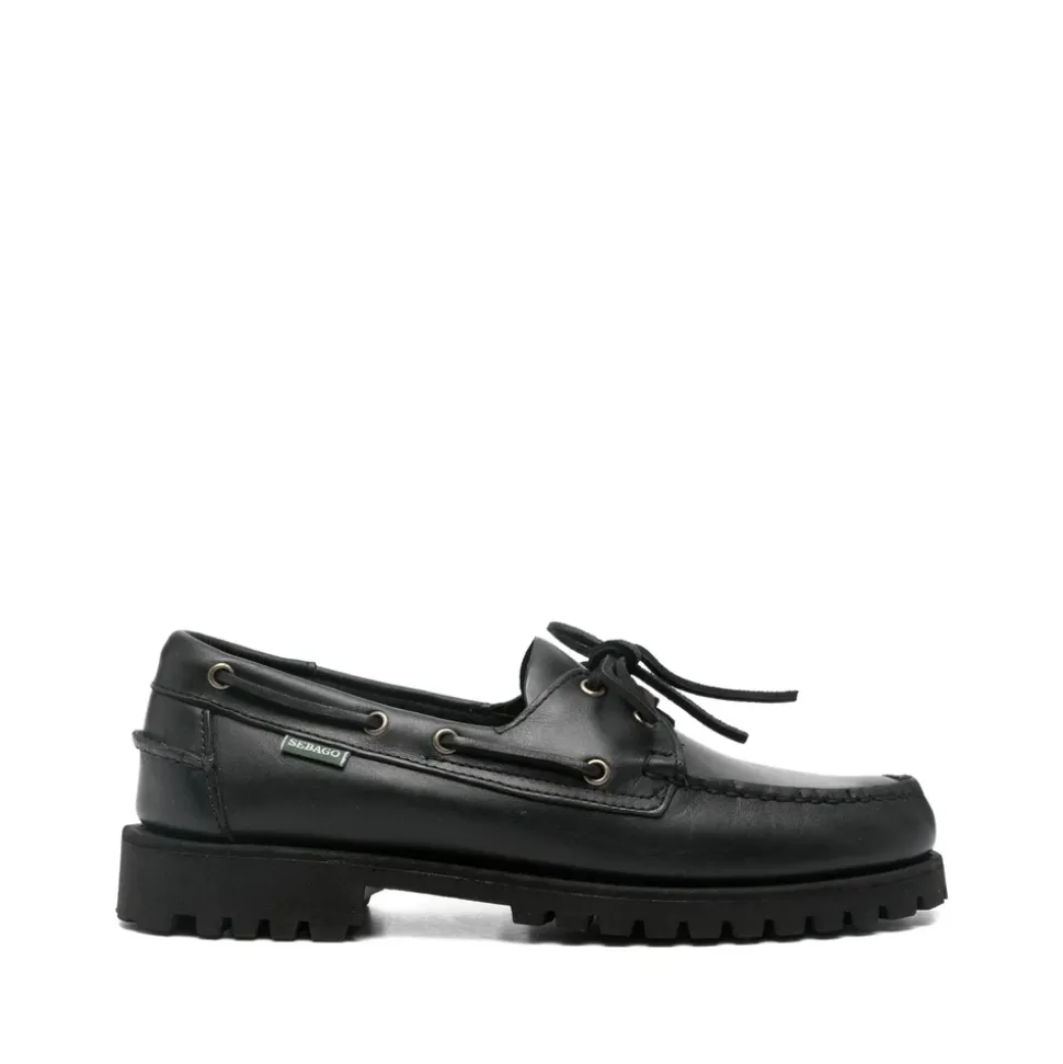 Sebago sorte snøresko til mænd med lug sål, topstitching og øjelet detalje. Lavet af 100% læder yderst, 100% gummisål og 100% stof foring.
