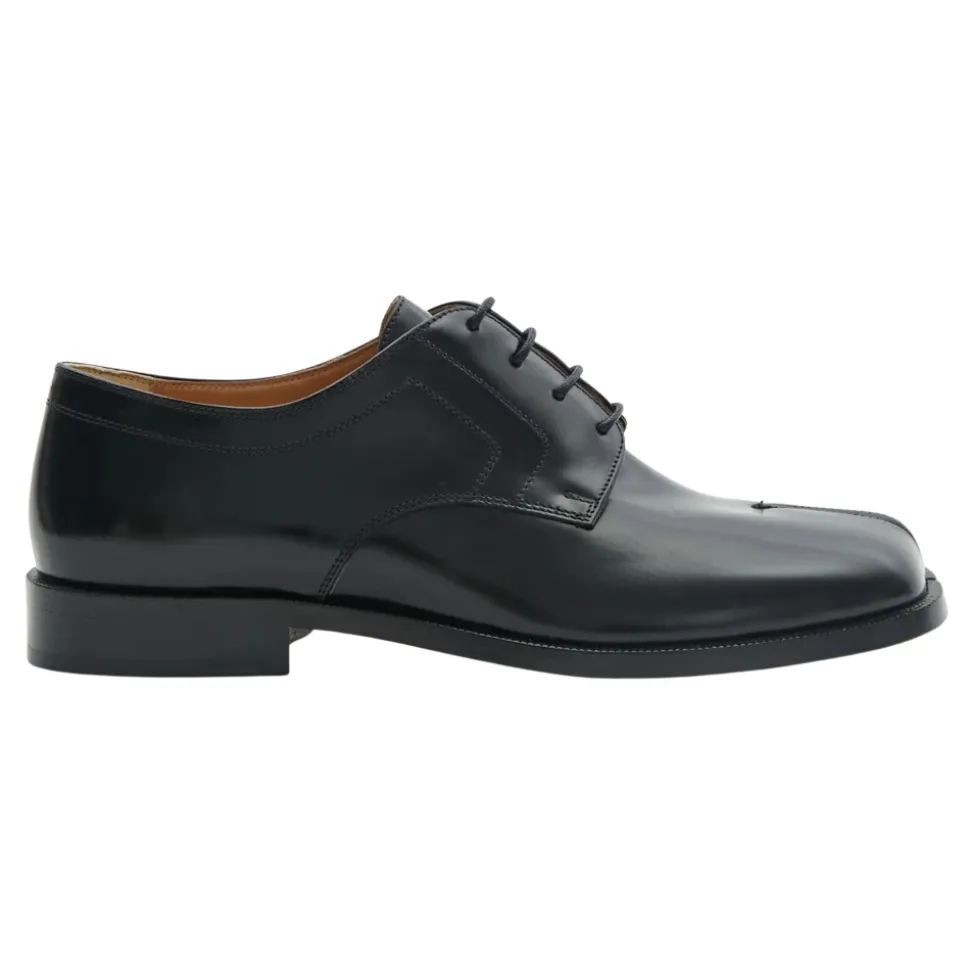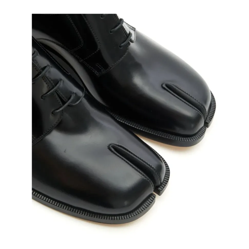 Fremhæv din stil med disse Maison Margiela sorte læder Tabi tå snøresko til forretningsbrug til mænd. Med en mærket indersål, stablet hæl og lædersål.