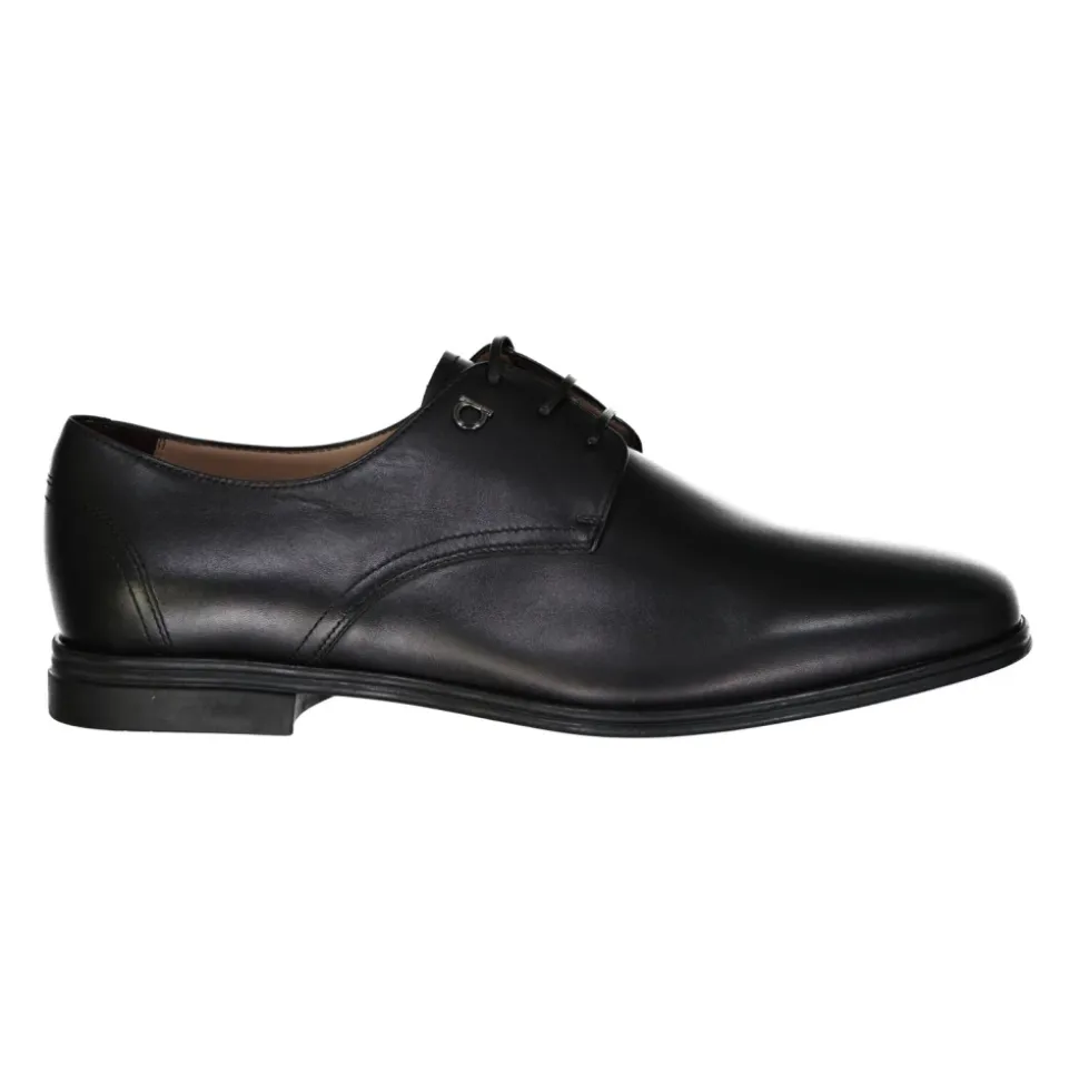 Salvatore Ferragamo Spencer Leather Derby sko er klassiske derby-sko med snørebånd, fremstillet i kalveskind og færdiggjort i Italien. De passer til formelle og business-garderober og tilbyder en raffineret, afrundet tå og poleret silhuet. Nøgleattributter: Sort | Kalveskind | Snørelukning | Rund tå | Derby silhuet | Sammensætning & pleje: 100% kalveskind | Indre: 100% Læder | Indersål: 100% Læder | Sål: 100% Læder