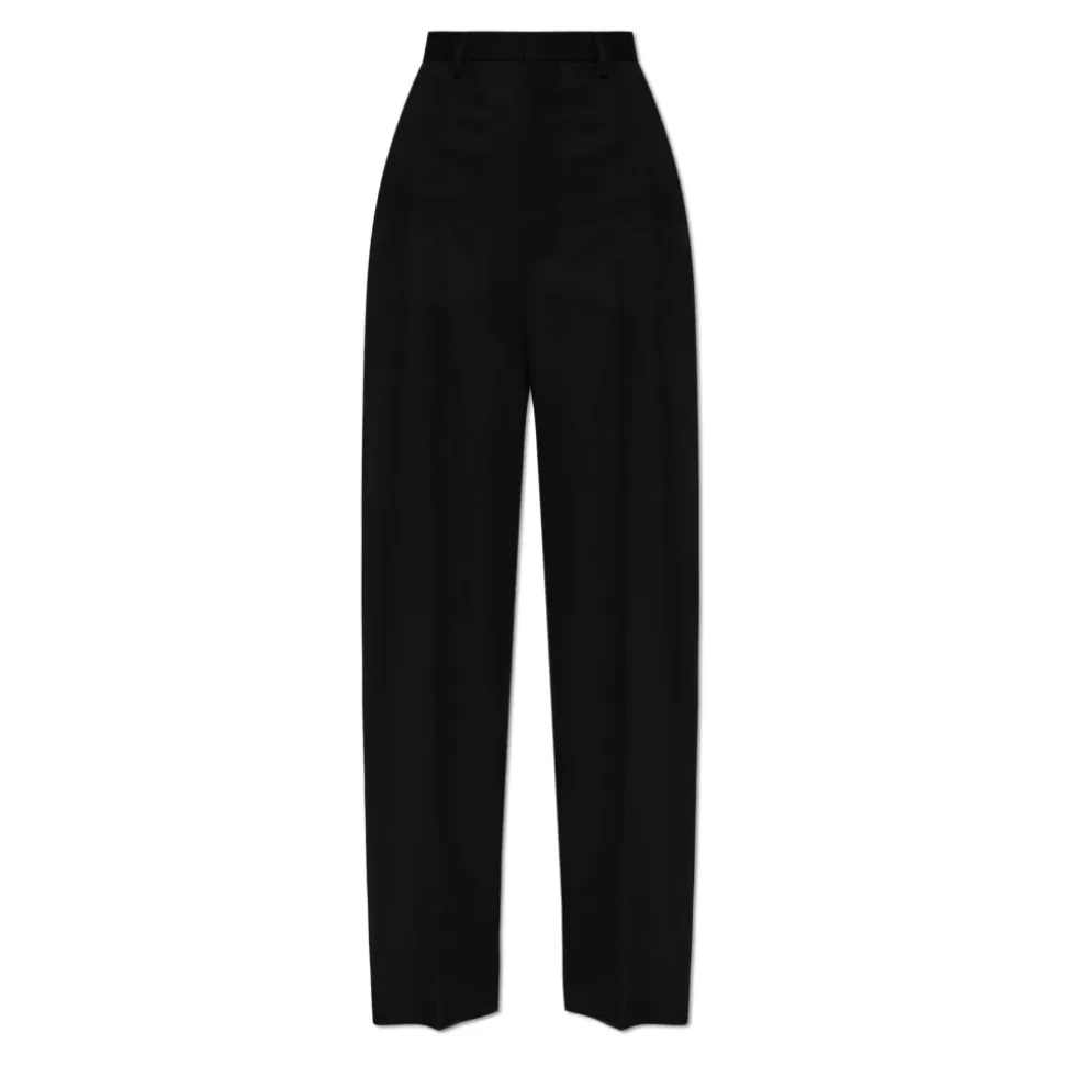 Balenciaga Store skræddersyede bukser er skræddersyede uldbukser, der kombinerer en afslappet, oversized silhuet med klassiske skræddersyede detaljer. De er fremstillet i barathea-uld og har pressede folder og et lige, bredt ben for et raffineret og alsidigt look. Nøgleattributter: Sort | Uld | Skjult lynlåsgylp med hægte- og knaplukning | 6 bæltestropper til justering af bælte | To skrålommer foran | En paspoleret baglomme med knap | Lige, bredt ben | Pressede folder | Paspoleret/welt baglomme med knap | Lang kant med let flare | Dimensioner og pasform: Modellens mål: Højde: 177 cm, Bryst: 83 cm, Talje: 61 cm, Hofter: 89 cm | Modellen er iført størrelse: 36 | Stor pasform | Sammensætning og pleje: Hovedmateriale: 100% uld | Lomme foring: 100% bomuld | Må ikke vaskes. Må ikke bleges. Må ikke tørretumbles. Stryg ved maksimal temperatur 120°C. Kemisk rensning med tetrachlorethen eller kulbrinter – mild proces.