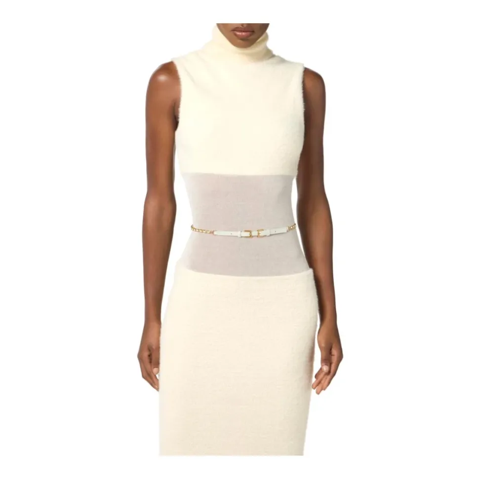 Elisabetta Franchi Strikket kjole med bælte er en ærmeløs midi med rullekrave, der kombinerer en blød pelslignende strik med en gaze-vævning i taljen. Kædebæltet med logo fremhæver silhuetten for et raffineret look fra dag til aften. Vigtigste egenskaber: Beige | Milk | Polyamid | Bælte med kæde og logo | Rullekrave | Ærmeløs | Længde til midt på læggen | Pelslignende tekstur | Gaze-vævning i taljen med transparent detalje | Mål & pasform: Længde 115 cm (IT størrelse 40) | Slim fit | Sammensætning & pleje: 83% Polyamid | 17% Bomuld