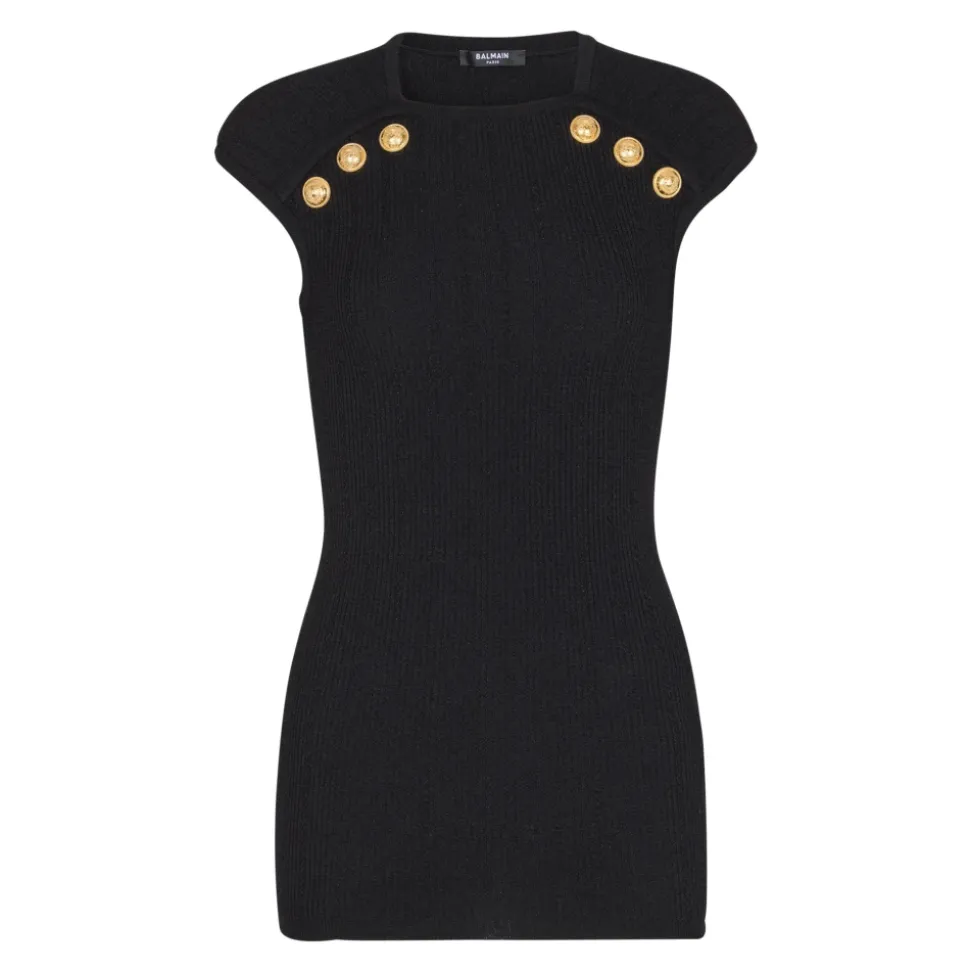 Balmain Striktrøje med 6 knapper er en figursyet striktrøje med rund hals, fremhævet med seks guldfarvede ‘Coin’-knapper for et poleret, elegant og afslappet look. Ideel til lag-på-lag eller sammen med skræddersyede underdele. Vigtige egenskaber: Sort | Viskose | Rund hals | 6 dekorative ‘Coin’ guldfarvede metalknapper foran | Rundhalset strik | Mål og pasform: Modellen er 180 cm høj og bærer en størrelse 36 | Figursyet | Sammensætning og pleje: 83% viskose, 17% polyester