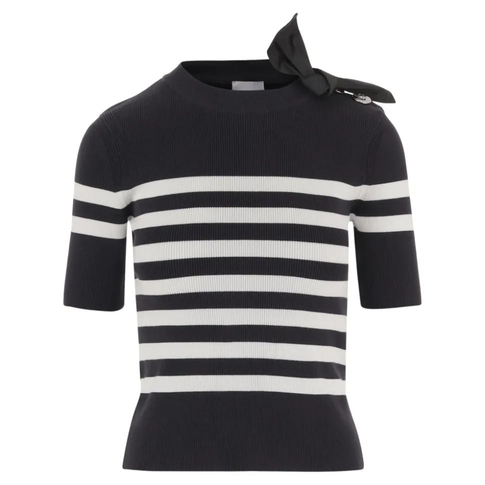 Patou Stripes Knitted T Shirt har en stribet strikket konstruktion med en rund hals og sløjfedetalje, velegnet til afslappet, poleret hverdagsbrug. Nøgleattributter: Flerfarvet | Offshore Striber | Bomuld | Rund hals | Korte ærmer | Strikket konstruktion | Stribet mønster | Sløjfedetalje | Sammensætning & pleje: 100% bomuld | Håndvask.