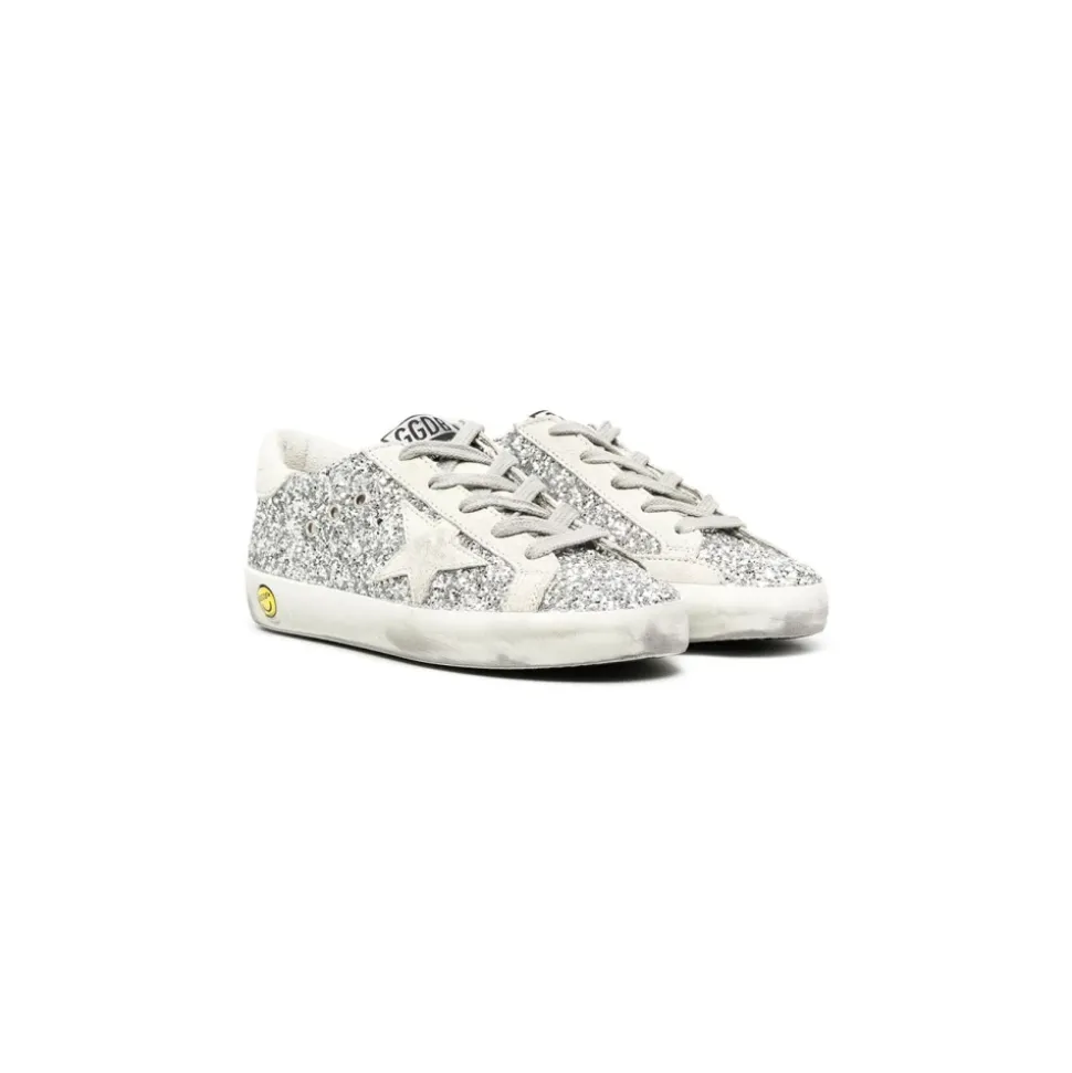 Golden Goose Super-Star Young sneakers kombinerer en funklende sølvglimmeroverdel med en grå ruskindstjerne og hælfane for et markant afslappet look. Håndlavet i Italien, de kombinerer vintage-inspirerede detaljer med hverdagsbrug. Nøgleattributter: Grå | Sølv | Is | Læder | Sølvglimmeroverdel | Grå ruskindstjerne og hælfane | Vintage slidt finish | Polstret ankelkrave | Håndlavede detaljer | Gummisål | Sammensætning & pleje: Overdel: 29% polyethylen, 25% polyurethan, 24% okselæder, 11% bomuld, 11% viskose | For: 60% okselæder, 40% bomuld | Sål: 100% gummi