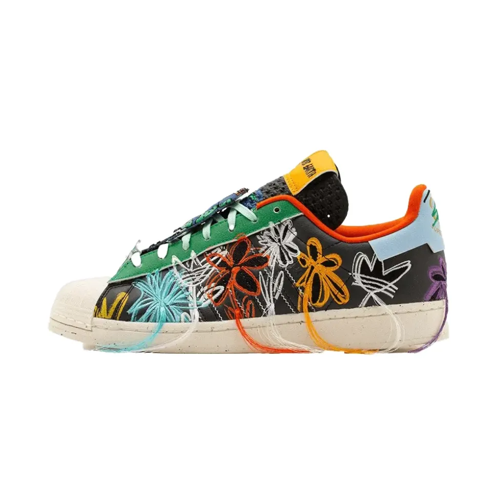 Præsenterer adidas Superstar AEC Sean Wotherspoon Superearth Black sneakers, et unikt samarbejde der kombinerer kunstnerisk stil med naturinspirerede farverige broderede grafikker. Fremstillet af genanvendte materialer, disse limited edition sko har en klassisk shell toe gummisål. Model der promoverer mode og kreativ udtryk.