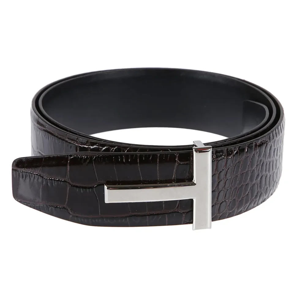 Tom Ford T Buckle Reversible Belt kombinerer labelens signatur T-logo spænde med en vendbar læderrem, hvilket giver et alsidigt finish til både formelle og smarte casual looks. Nøgleattributter: Brun | Espresso | Læder | Vendbart design | Justerbar stiftlukning | Spændelukning | T-logo spænde | Grainet læder finish | Dimensioner og pasform: Bredde: 4 cm | Justerbar pasform | Sammensætning og pleje: 100% Kalvelæder | Hardware: Messing (palladium galvanisering)