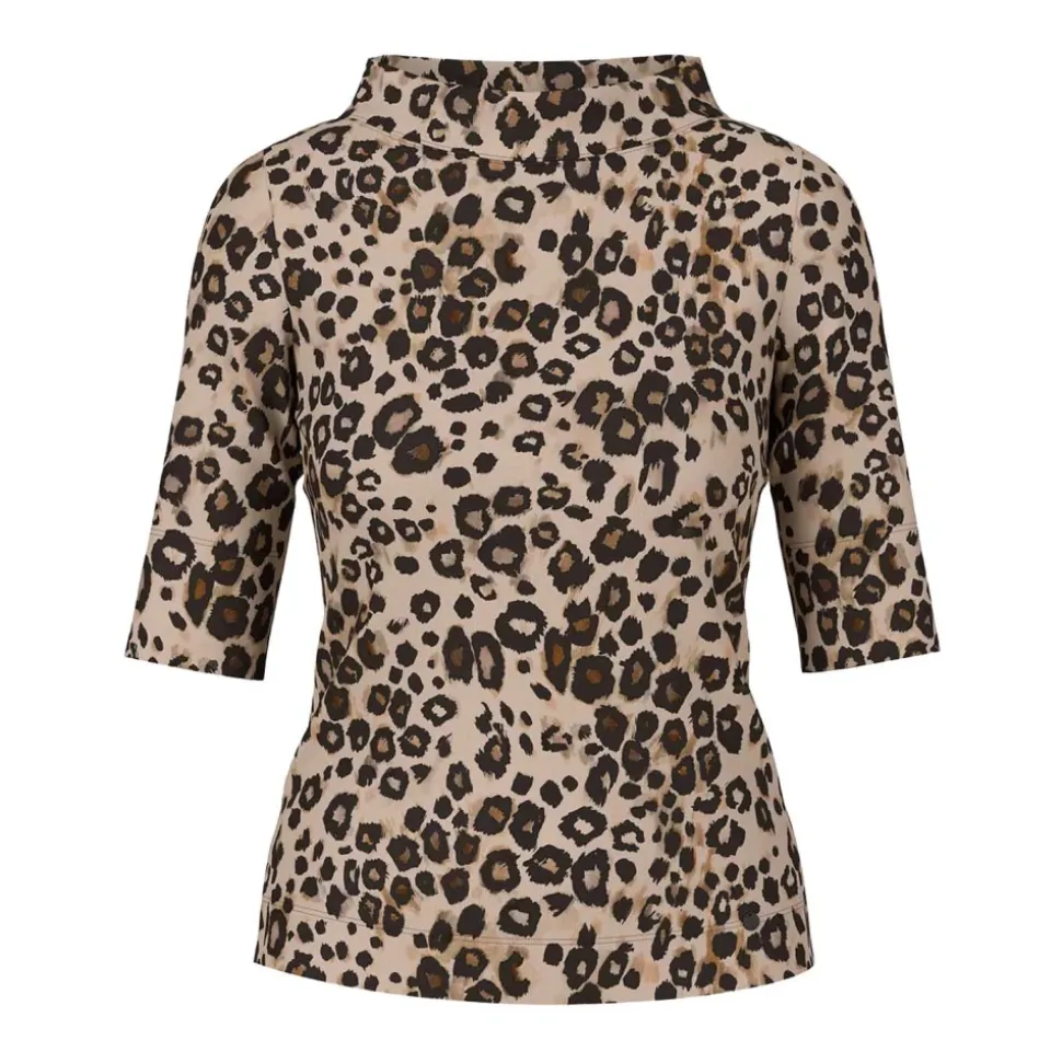 Denne bløde T-shirt lavet af strækbart bomuldsmateriale kombinerer komfort med stil. Den lige snit med let taljering sikrer en feminin silhuet, mens mellem-lange ærmer og en blødt foret rund halsudskæring fuldender designet. Det iøjnefaldende leopardprint giver trøjen et moderne, trendy look – et must-have for dem, der elsker afslappet elegance.