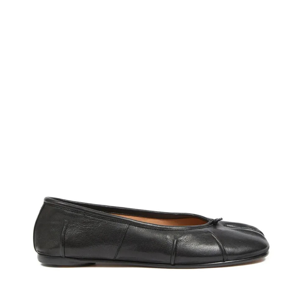 Maison Margiela Tabi Ballerina, der kombinerer mærkets ikoniske split-toe silhuet med en lav, flad profil og knudedetalje – designet til et poleret hverdagslook. Vigtigste egenskaber: Sort | Lammeskind | Slip-on model | Flad sål | Tabi split-toe | Knudedetalje | Signatur enkelt-sting logo ved hælen | Flad lædersål | Sammensætning og pleje: Ydre: Lammeskind 100% | For: Kalvelæder 100% | Sål: Kalvelæder 100%