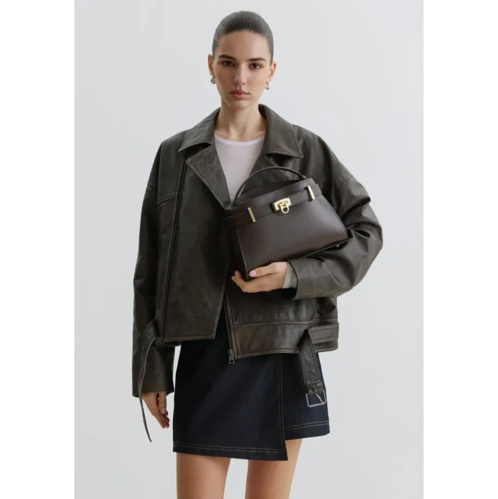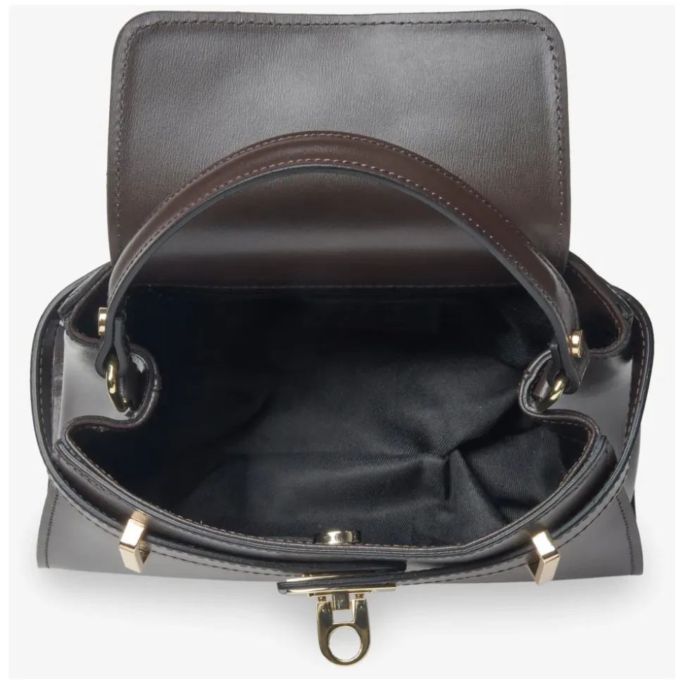 Estro taske kombinerer førsteklasses italiensk læder med en struktureret silhuet og alsidige bæremuligheder, der passer til både hverdagsbrug og finere lejligheder. Nøgleattributter: Brun | Læder | Spændelukning | Et hovedrum | To indvendige lommer | Justerbar skulderrem | Top håndtag | Struktureret silhuet | Guldfarvet hardware | Top-håndtag taske design | Dimensioner & pasform: Længde: 26 cm | Højde: 19 cm | Bredde: 8 cm | Kort håndtagslængde: 28 cm | Justerbar remlængde: 97 cm | Sammensætning & pleje: 100% læder (ægte italiensk læder) | Foring: tekstil | Aftørres med en blød, tør klud. Opbevares i den medfølgende støvpose på et tørt, ventileret sted væk fra direkte sollys. Undgå fugt og tæt stabling.
