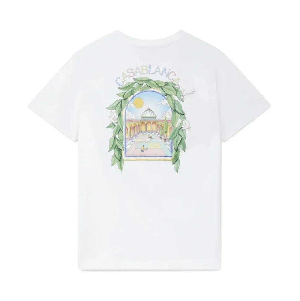 Forkæl din afslappede stil med denne hvide Casablanca ‘L’Arche De Tennis’ kortærmede t-shirt. Lavet af 100% bomuld, den har en trykt grafik på brystet og ryggen, klassisk ribbet halsudskæring og en afslappet pasform.
