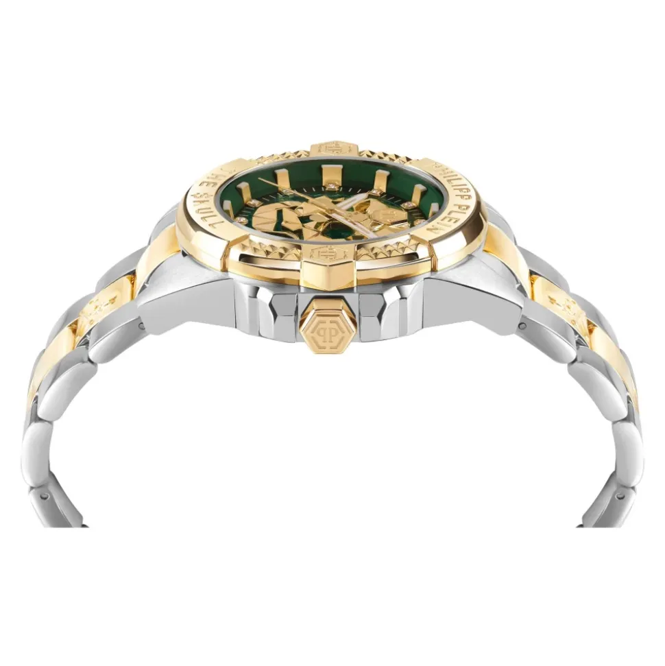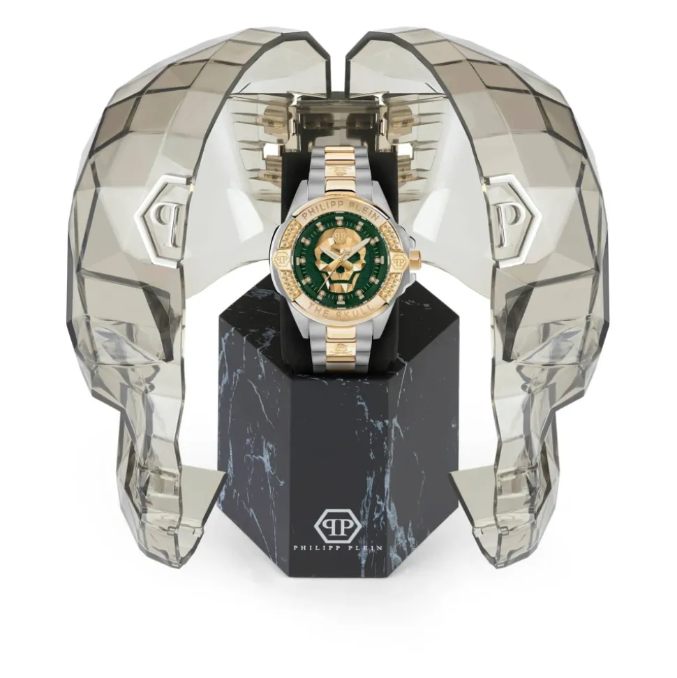 Philipp Plein præsenterer THE $KULL GENDERLESS 41MM ur til mænd. Med et tofarvet urkasse, grønt urskive udsmykket med strass-sten, rustfrit stål urkasse og rem, og et kvartsur. Vandafvisende op til 5 ATM. Leveres i en Philipp Plein dødningehoved gaveæske.