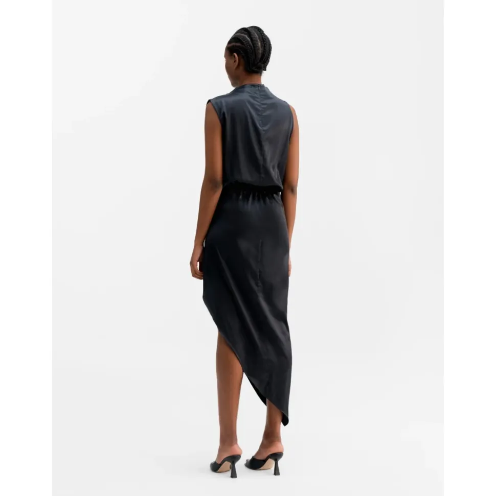 Tilda-kjolen er skåret i en blanding af acetat/stretch med en satinoverflade. Den har asymmetriske folder til drapering langs halsudskæringen og en skjult lynlås i nakken bagpå. Nederdelen har en høj slidse og er placeret med folder til drapering, og der er elastik omkring taljen. Den perfekte kjole til sene fester. • Pasform: Normal i størrelsen, tag din standardstørrelse. Modellen er 172 cm høj og bruger størrelse small. • Kvalitet: 65% acetat, 31% polyester, 4% spandex • Vedligeholdelsesinstruktioner: Håndvask. Må ikke tørretumbles. Stryges ved svag varme.